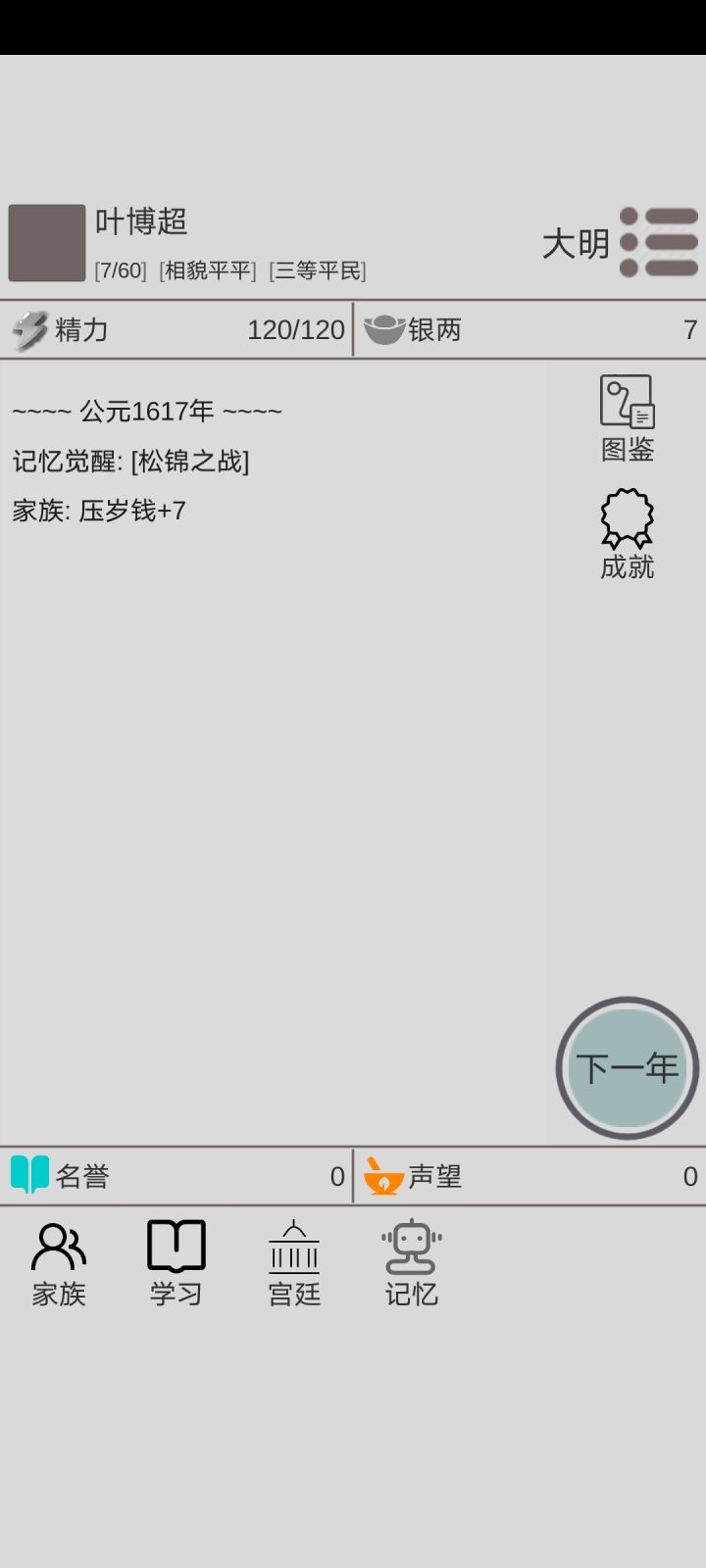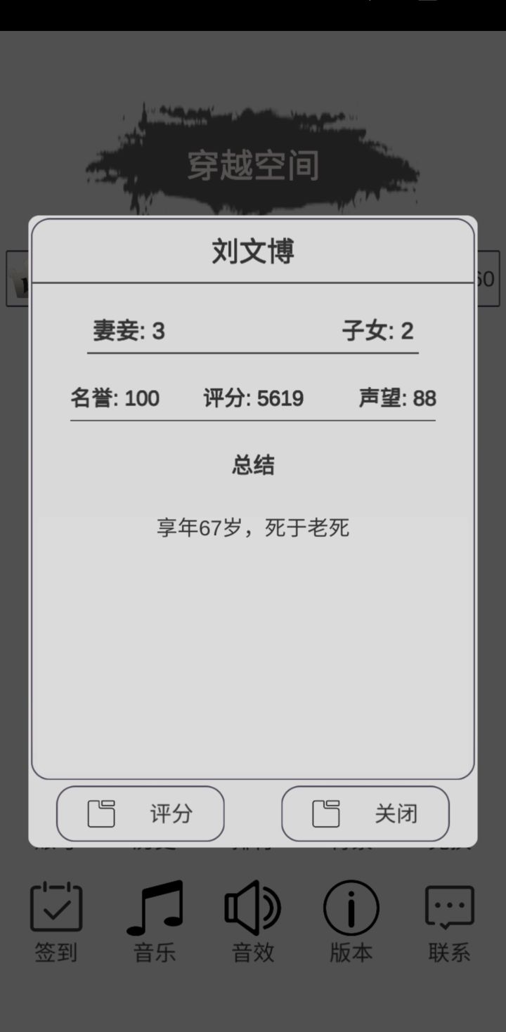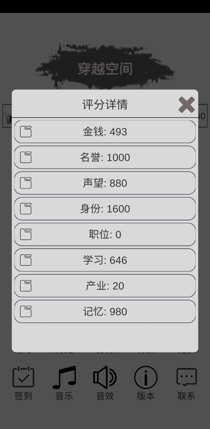 金钱:总数÷1万名誉:总点数×10声望:总点数×10身份:未知(皇帝1600)职位:未知学习:总点数×2(比如处世学满是200×2=400分)产业:总等级×20(与种类无关)记忆:未知(都是一千左右)空间币:评分÷50