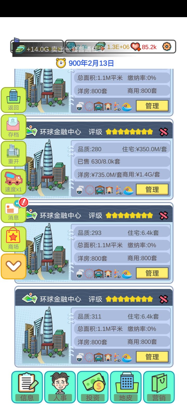 攻略:开局招聘用猎头 看视频招聘 招齐专家级(项目经理 工程 土建 水电) 另外招2个专家级建造师 然后从商场里面把能获取的钻石全部看视频翻倍获取 解锁2个建造师的空位 住宅100 洋房及商铺各10(温馨提示:全部职位人员都来应聘再招聘他们,避免前期人员未招满,导致资金浪费,且全部职位招满再动工可提高房屋品质) 调整好之后 开始动工 然后在营销里面 点击秘书及鼓励师 确保2次以上的建造速度×4 在