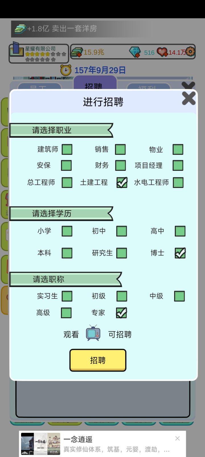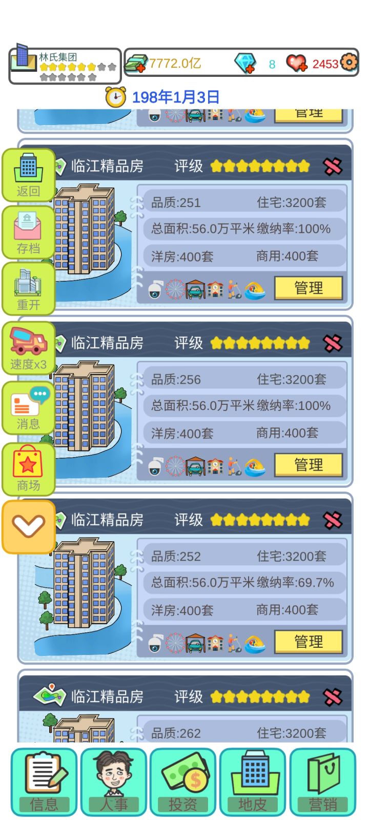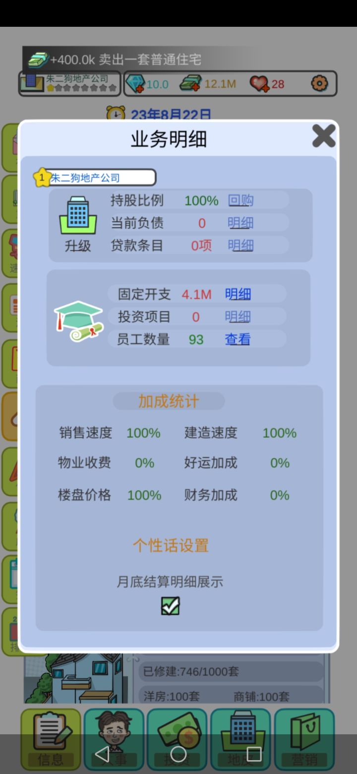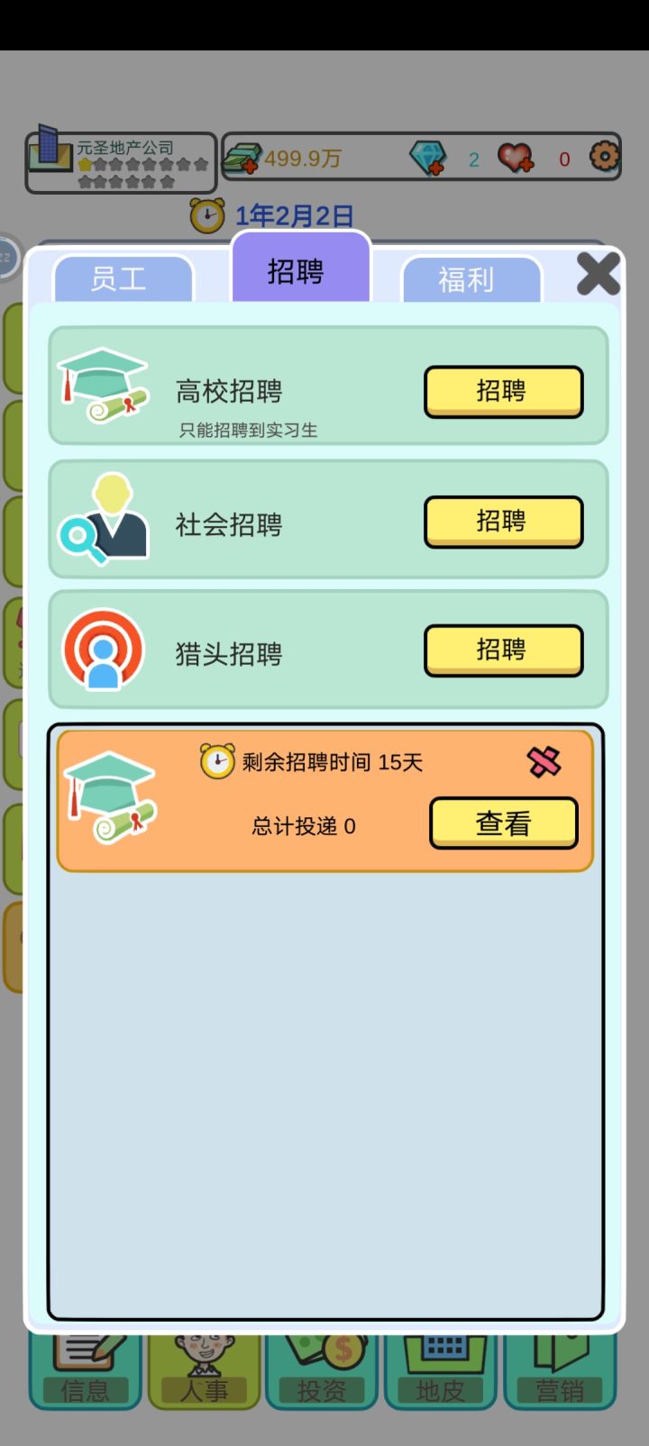 总结:一:希望招聘处能多几个选择、比如添加一些年龄的选择、能力值的选择二:地皮太单一了、而且建来建去的都是住宅、洋房、商铺的、希望开发一些可以建造大厦啊、酒店啊、公园、公司啊、三:升星真的太难了😂😂希望开发者接纳