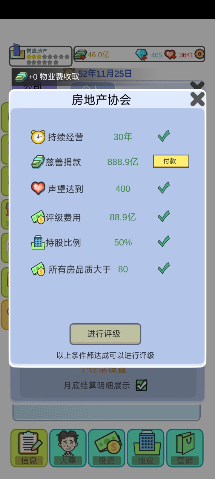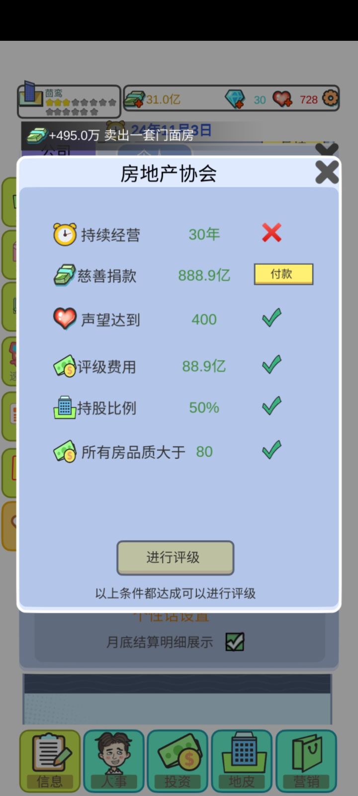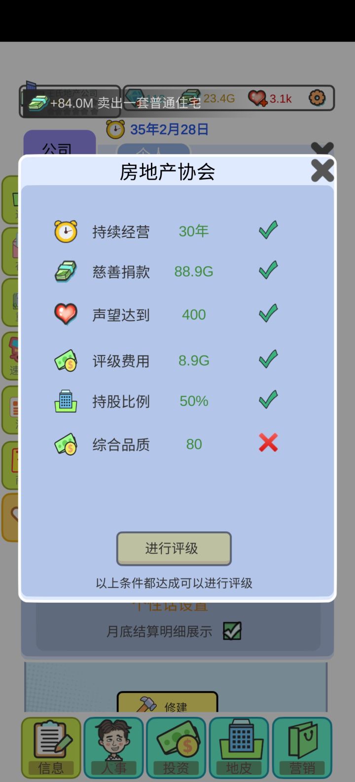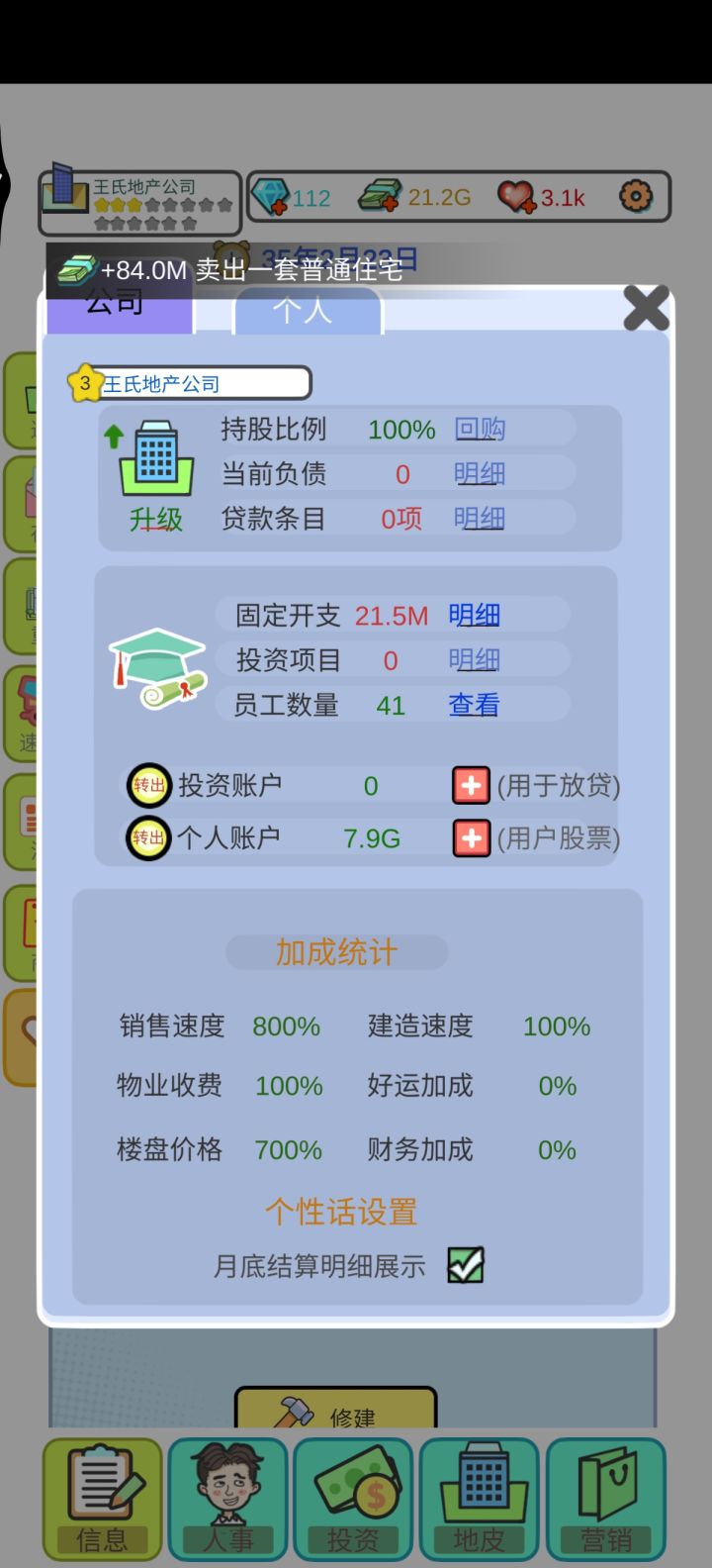 总结:一:希望招聘处能多几个选择、比如添加一些年龄的选择、能力值的选择二:地皮太单一了、而且建来建去的都是住宅、洋房、商铺的、希望开发一些可以建造大厦啊、酒店啊、公园、公司啊、三:升星真的太难了😂😂希望开发者接纳