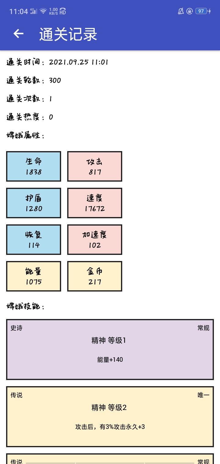 纪念一下嫦娥奔月第一次通关(嫦娥等级5),概率加伤是真的好用,刚开始的进化有加能量最好(不然能量一下就没了)攻击后回复护盾和能量简直就是碎石利器,很轻松就通关了