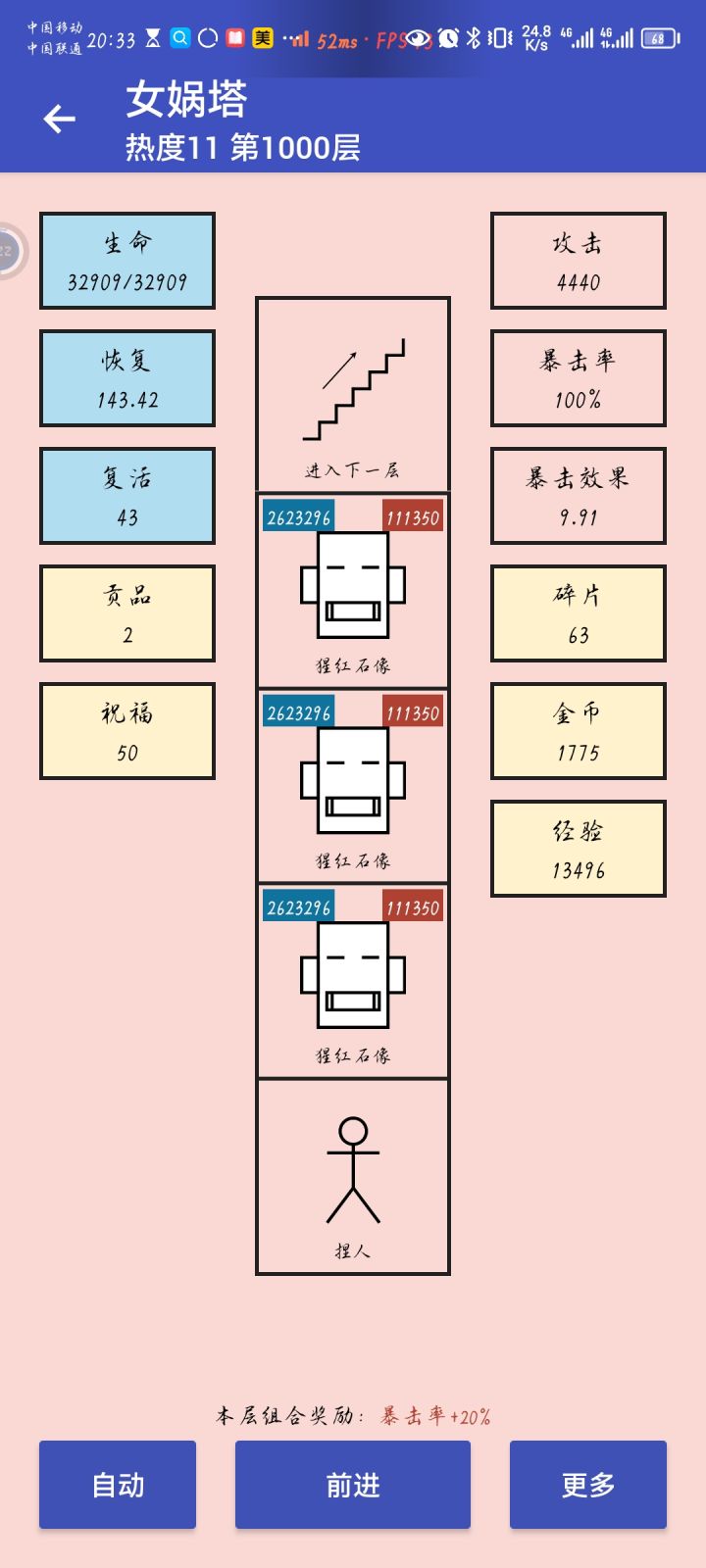 总结:凡控制闪避和虎啸山林之外的东西皆为不纯之物(还有复活次数)你看看,五千万血,攻击被遮住了,有几百万免伤?免个锤子,全靠控制和闪避伤害全靠虎啸山林打(高贵的百分比伤害)(还有秒杀)复活次数是提高容错率的,一千二往后都是扛不住直接秒。闪不掉的就靠复活次数冲除去开头的复活+攻血,闪避控制之外的东西都没有必要点,直接放弃,没用的东西加进来只会污染强化池子,钱优先拿来买复活次数我这把buff