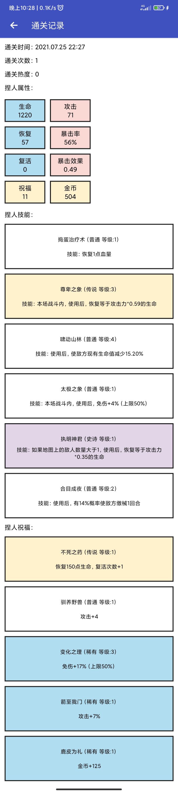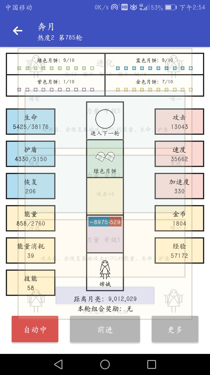 挑战100%月饼又一次失败,复活了两次,能量一直回满,估计是不可能在下一次复活前,消耗完能量了,只能点神技通关算了。这次算最高,大概月饼出现概率大概是750%,加上绿色蓝色格子几率替换成月饼,换算下大概超过了80%的图案都是月饼。感觉唯一成功的可能是月饼几率点到差不多时,最后一下碰到改造室,购买全部月饼几率+10%,再随机技能出加绿色月饼出现几率的传说技能。不过几率还是小,太难了,这对于非酋不可能,对于欧皇说不定就算0.1%遇到改造室,他都能连续遇到😔