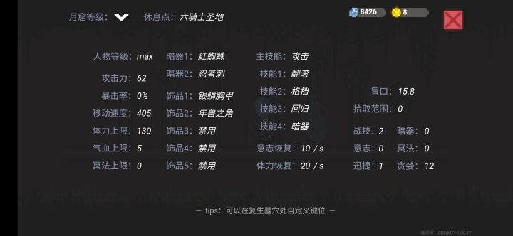 操作优化有问题,时间一久一按攻击,暗器,跳跃就卡,特别是用摇杆的时候,更快进入卡死状态成就bug螳螂和公主月亮的记忆会莫名其妙的消失npc问了个遍,没有松子那个记忆回城技能一样没有找到年兽角目前还没效果天赋移动里面闪避消耗减少的那条没有效果,其他的效果有效