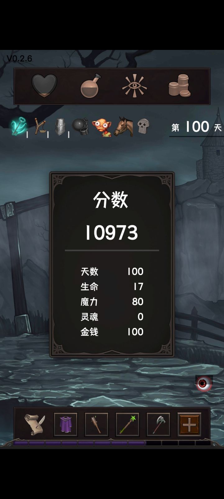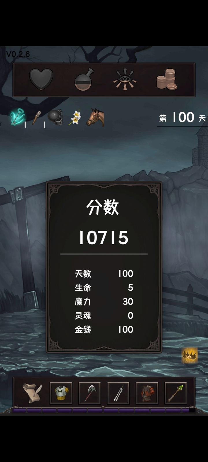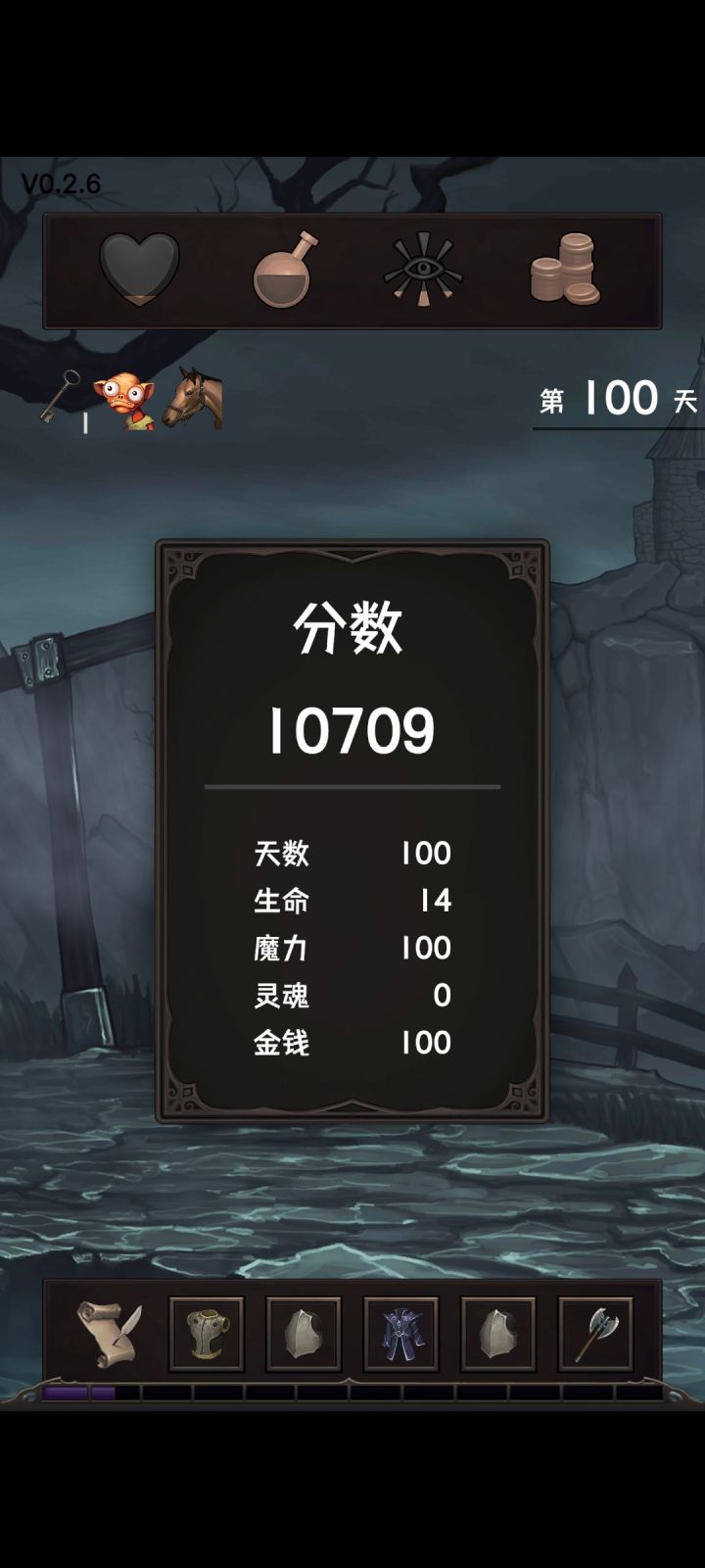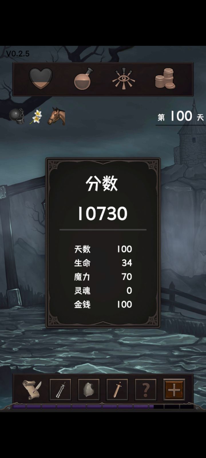 0.2.4:修复了吸血鬼鲜血诅咒无法消失和效果异常的bug。0.2.5:将修复赌徒赌牌上下滑有可能出现与预期效果不符的一个bug。0.2.6:修改退出界面,适配Pad宽屏。下下下N个版本:加入多个结局,增加事件,制作等级相关内容。