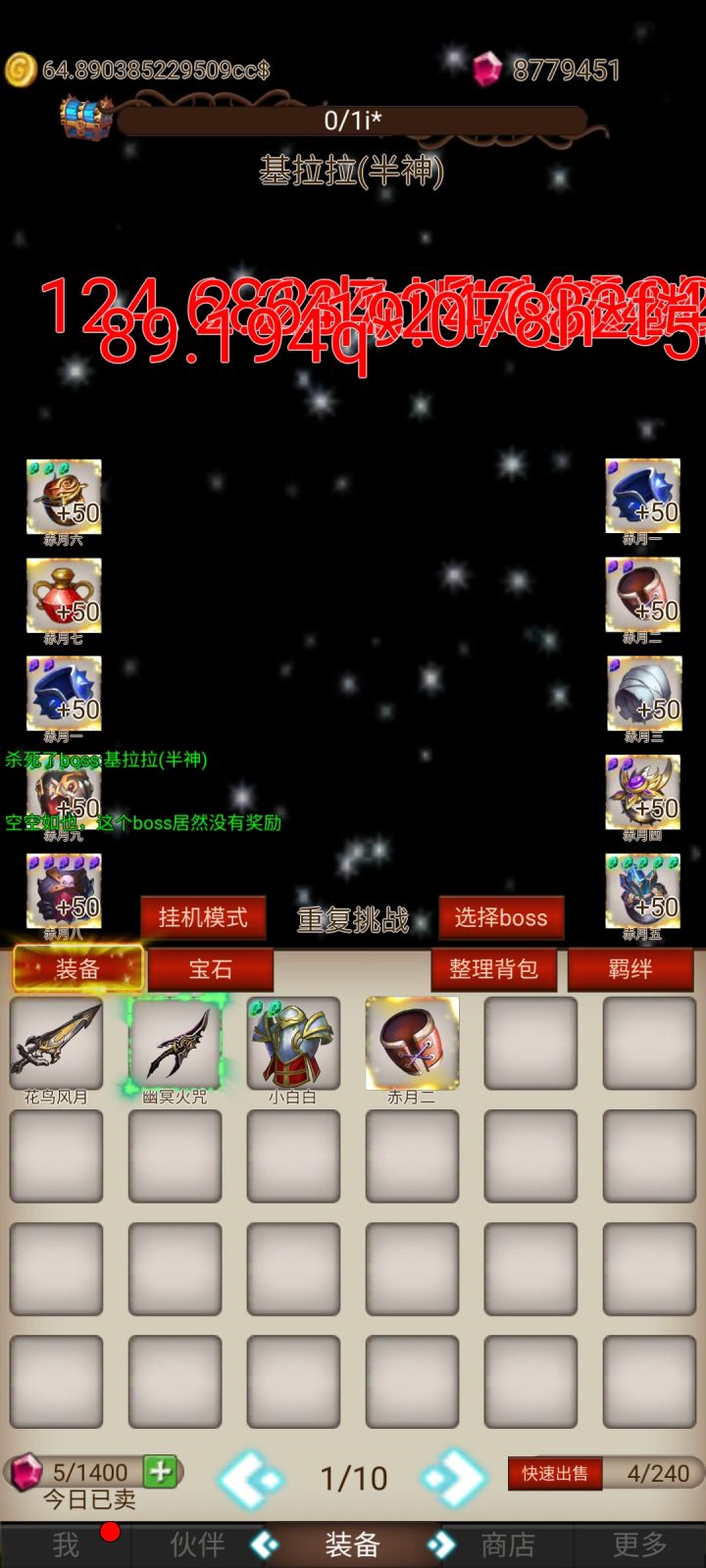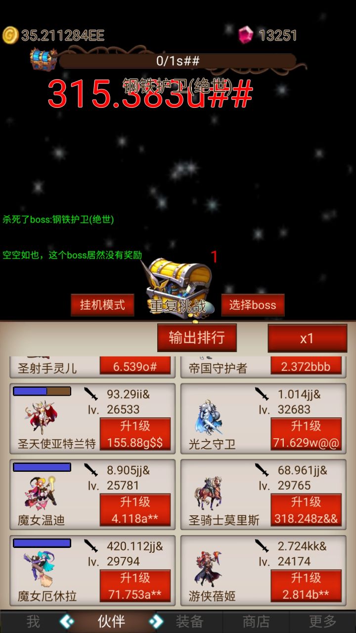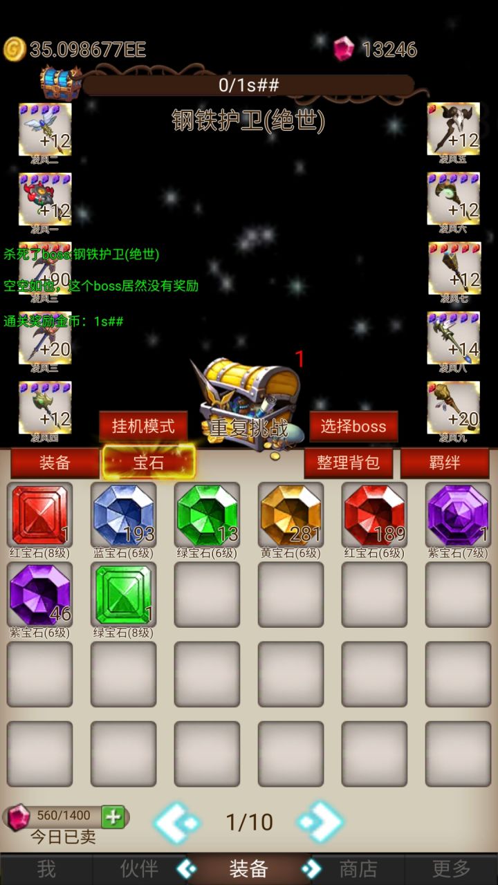 游戏的玩法非常简单,主要是主角和小伙伴共同升级挑战boss1第一次通关boss后必给一件装备。通关过后可以重复挑战当前boss来刷装备。2装备可以强化,强化需要钻石,强化到高级别会有失败几率,失败不会掉级,这是最好的地方。但是钻石会丢失。3钻石可以通过每日签到领取,以及看广告,成就获取。还有一个最特殊的,是通过出售装备获取,也就是说打到的没用的装备可以直接卖掉换取钻石。但是每日有获取上限。但
