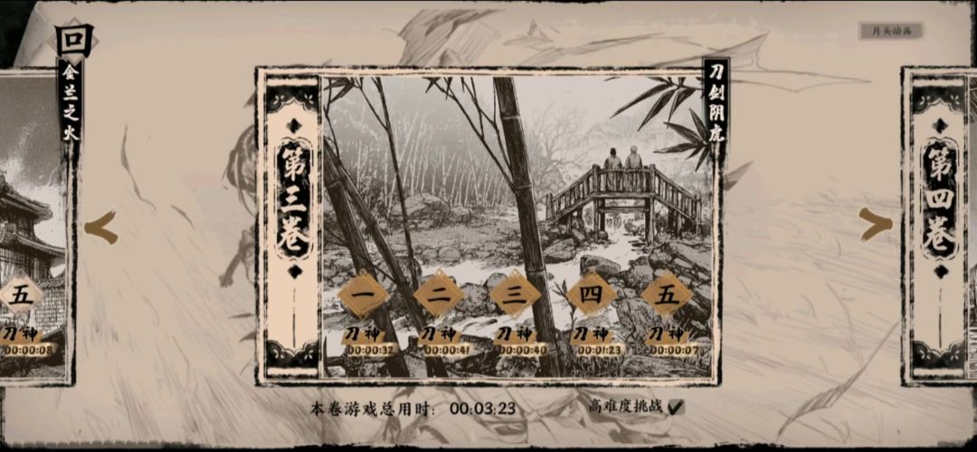 整个游戏,刀神通关最难的我觉得是3-4关(第十四回),因为该死的神秘商人把末刀偷了,只留下飞镖。普通模式下可以捡刀,高难度挑战里没有刀。用飞镖虽然能远距离攻击,但是没有防御,一不小心就死了,所以要不停地刷。总体没有太多技巧可言,除了练习边闪边击和最优走位,最重要的还是看运气。这次为了录视频,刷了好几个小时,记得第一次打刀神可能刷了一个礼拜,至少有三四天。对我来说这一关的高难度挑战刀神真的是一种折磨