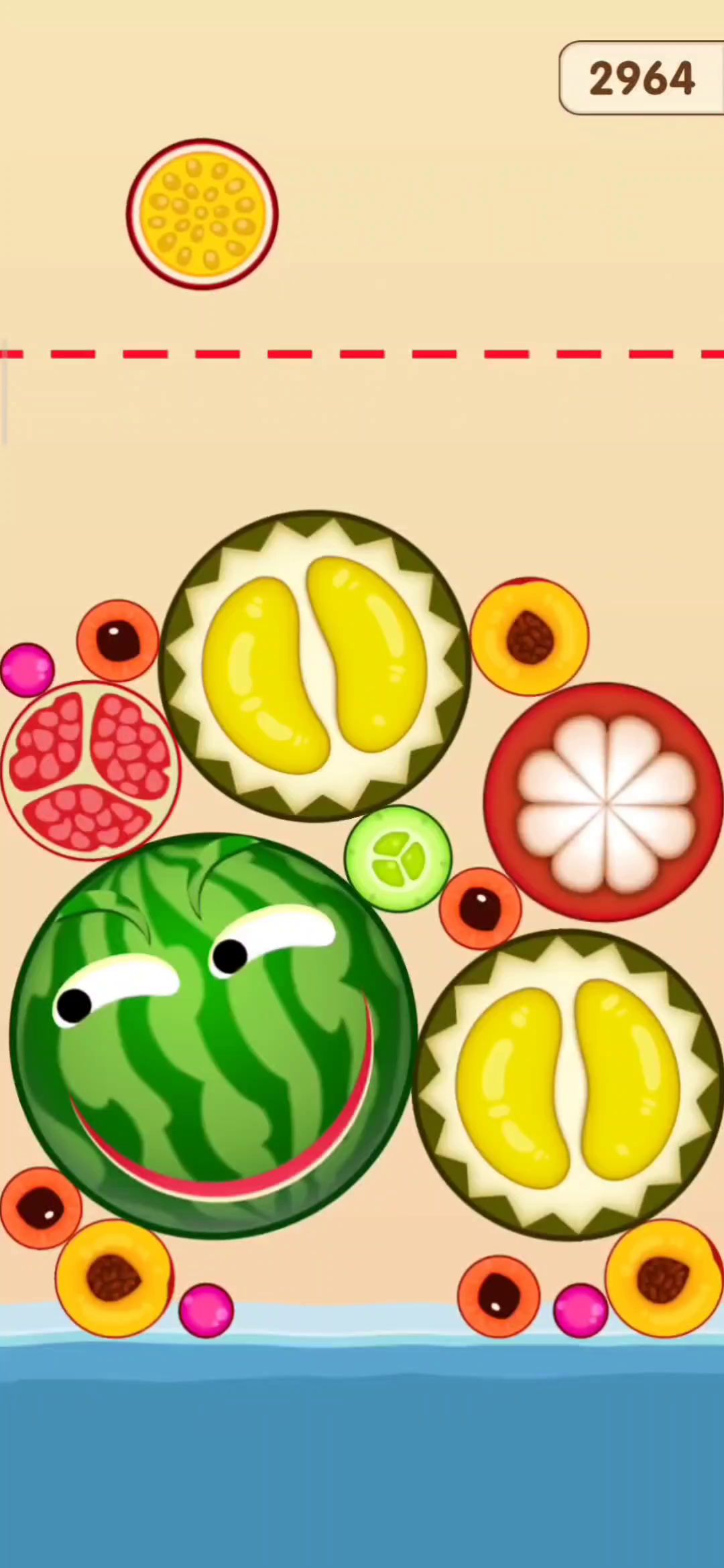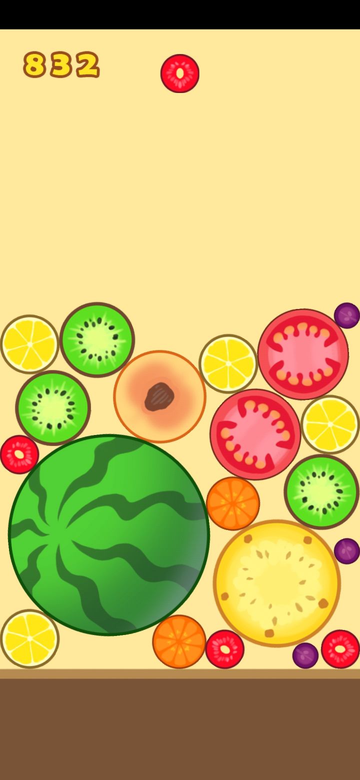 合成大西瓜中需要将下落的水果进行堆叠合成,当两个相同的水果碰撞接触时,便会合成出一个更大的水果,水果的合成顺序从小到大分别为:山竹、苹果、橘子、柠檬、猕猴桃、西红柿、桃子、椰子和西瓜,当合成出最大的西瓜之后,便会判定会合成成功游戏通关,但在合成出大西瓜之后还可以继续进行游戏,可以继续挑战获取更高的游戏分数或是合成出更多的大西瓜。在合成大西瓜的游戏过程中建议注意以下几点:首先在起手布局阶段时,建议
