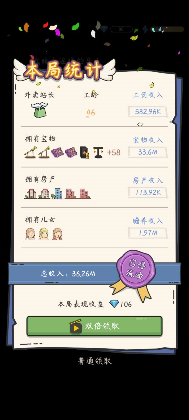 玩了两天,大概育成10多把,说下我的经验,这游戏是抽卡游戏,卡牌决定你赚钱多少,爽快程度,广告特别多,很多功能还必须看广告,非常浪费时间,挺恶心的,游戏性中规中矩,玩这个游戏,最好干其他事时顺便游玩,不然会被广告折磨崩溃。1、刚开始玩看广告把钻石领完,抽卡尽量抽到“传家宝”,这是游戏唯一的继承机制,继承古董;“黑客卡”等级高就从事程序员,“大明星卡”等级高就从事明星,前期智力颜值基本无法突破950,看广告提升工作等级,半年工资一般32000左右。2、生孩子赚养老钱,刚玩最多养4个孩子(教育学校最好),不然很容易破产,老婆一般只能生两个孩子,领养还能领一个,可以离婚找新妻子生孩子,离婚会收一半资产,将资产买古董和房产可以减少损失,中后期有钱想生几个孩子都行。3、教育:孩子教育不用花体力,让他们去最好的学校,加上卡牌有“神童”“特长生”可以提高后代属性与高考加分,几乎不用浪费体力和时间教育孩子。4、炒房:留意“小报”里面新闻(特别是右下角的小字新闻)炒房是这游戏最简单、最快捷赚钱手段,前期炒普通住宅、高档小区,中后期炒学区房、别墅,新闻最低价:跳楼价,最高价:突破天际。(卡牌:富丽堂皇,卡牌等级高后,低价购买房产时,将装修拉到最高,等行情好时,卖价轻松翻倍)5、体力上限:体力上限需要购买载具,卡片“懂车帝”能加载具使用年限,刚玩推荐二手车、面包车,轿车,有钱直接飞机。6、好感:好感运用于借钱,兄弟姐妹、邻居朋友中,寻找职业好的vip礼物刷好感,借钱能借最大500k,普通职业最多借50k顶天,妻子、丈夫、子女好感也要刷满,父母、普通职业的兄弟姐妹,尽量别刷好感浪费体力。当然,体力多为了提高情商随便。7、古董:古董价格一般看等级、品质,收的品质越高,修复后卖出的价钱越多,碰到有些买古董的,一出手是古董底价的,加价,加价两次,洗脑看广告,一般能多30%—50%左右卖出,太高会洗脑失败。(上述是有店员4人属性关系不差情况下,如果没有店员提升,加价一次,洗脑最多能提高10%-20%左右)8、“投资理财卡”是主要赚钱手段之一,你手里钱越多,利息越高,超过3g,基本上就不用炒房了,靠吃利息就行。9、宠物:宠物很重要,可以增加幸运值,最好的宠物是看广告获得的锦鲤,幸运值300,买完将关系拉到最高,幸运值才能最大提升,每回合买一次彩票,有宠物加持,很容易刮出一等奖500k、特等奖5m。(不刮彩票可以养只玄学养老)10、后街:健康提高去健身房,心情提高去剧本杀,整容最好去正规医院,成功加容颜和心情,慈善加名声,情商和兄弟姐妹、子女互动里“陪伴”能加关系和情商。12、后期古董推荐:白蛇剑144m,被诅咒的手杖125m,钻石项链124m,铠甲100m,玛瑙棋子86m,都是史诗。13、钻石:钻石非常重要,结算系统不太看重金钱,非常看重体魄、心理,这两项只能通过健身房、剧本杀刷属性,属性越高钻石越多,我最好一次体魄9000,心理11000,金钱18g,钻石能拿470多(不算双倍),所以钱到3g基本就可以了,主要是属性。最后说下前期操作,刚玩别找工作,看自身属性适合适合哪样工作,去整容医院或图书馆,将颜值或智商刷到450,应聘相应职位,看广告提高薪酬和工作等级,买载具加体力,买宠物加运气,刷关系、情商,每回合买彩票,看小报炒房,前期刷古董摊买卖商品数量,升级古董摊,请员工;缺钱的话,第二回合去古董摊辞退员工,有“传家宝卡牌”65岁以前,尽量囤积价格高的古董,以便于后代继承;有体力就去剧本杀和健身房,刷体魄和心理数值,金钱超过350m后,只炒别墅就行。还有卡牌带来的运气、名声、装修提高价值、后代赡养费提高等等,在这里就不说了,这里简单列举一下我的经验,希望能给大家提供一点帮助😁
