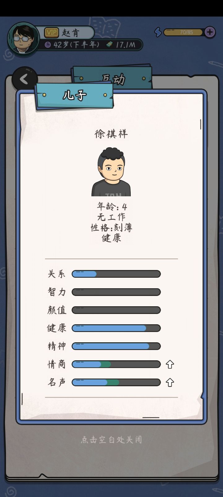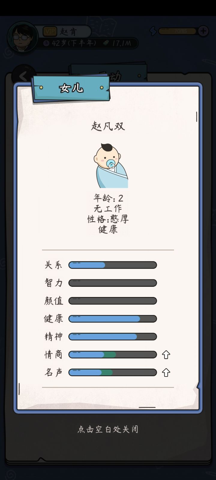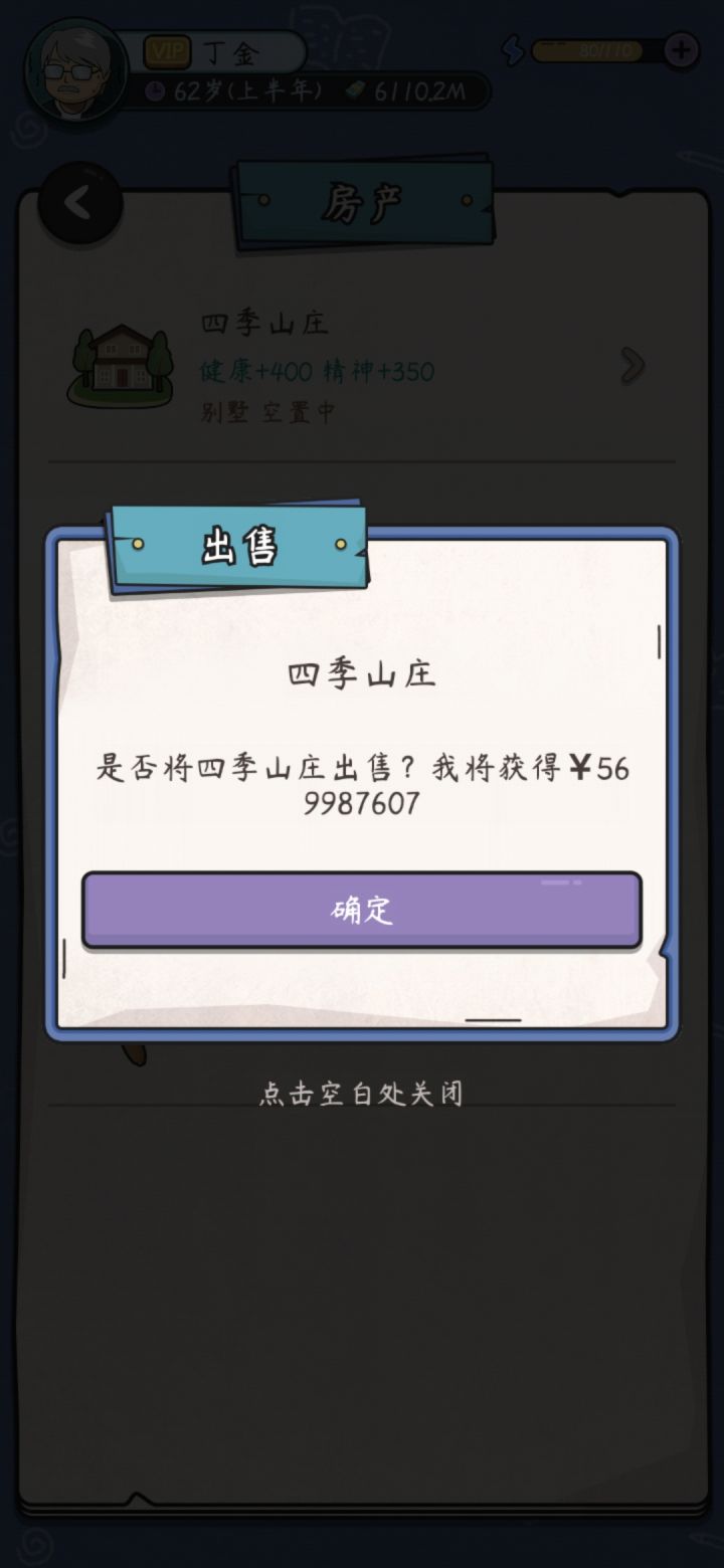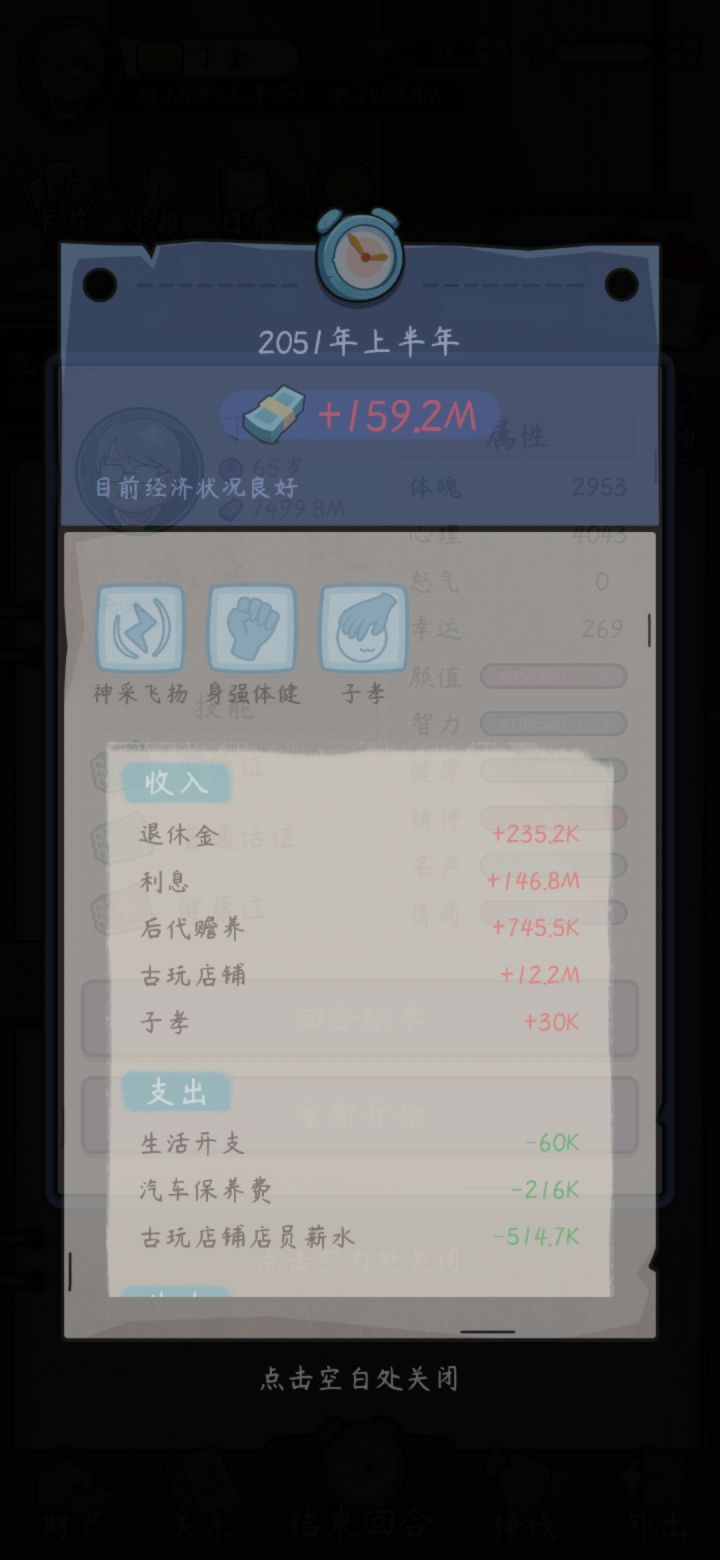 两个问题,一个后代天生数值满的后面工作显示该数值并没有卵用,上大学也一样选不了数值看着是满的。第二个技能加成太变态了只要买房装修卖房轻松破百亿。我只刷了三波就八十多亿,每个月利息一个多亿。虽然很爽但是感觉影响平衡,影响游戏寿命。买房装修再卖别墅同一年五千万一套房我技能是八级,不同年涨了更夸张4亿一套。