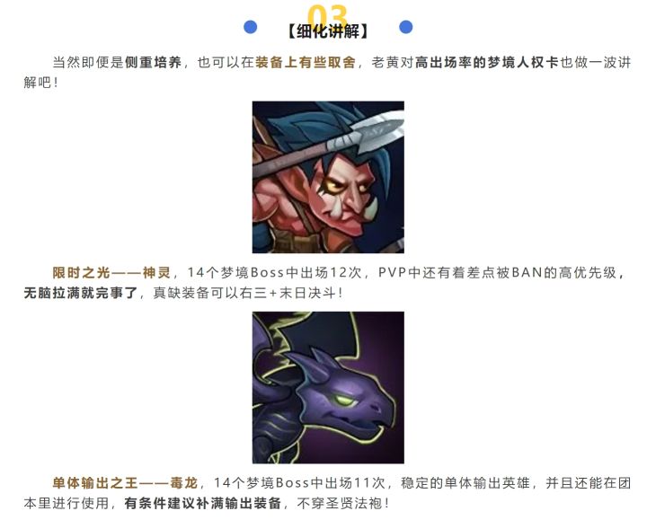 队长大大们好,这里是老黄说dota,欢迎大家移步公众号获取最新攻略。永生梦境是小冰冰传奇的主要资源获取玩法之一。在梦境Boss的不断上新下,现在的梦境一共有14个Boss进行轮转,那么对于离开推图期想针对梦境练英雄的队长来说,如何侧重培养是个问题。老黄对梦境高伤阵容整理之后,对现版本的梦境环境有了一些总结,一起跟着老黄来看看吧!今天的内容就到此结束了,这里是老黄说dota,各位队长大大我们下期