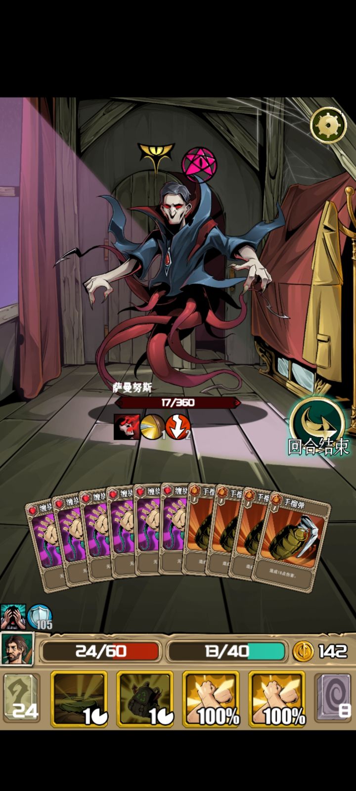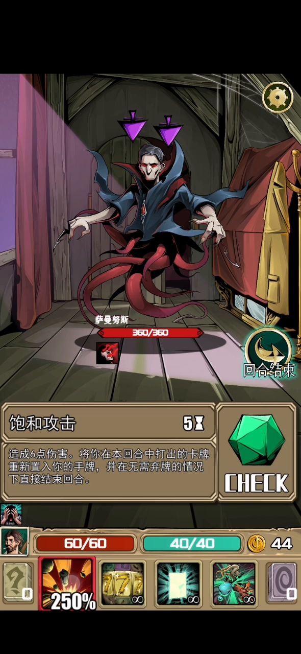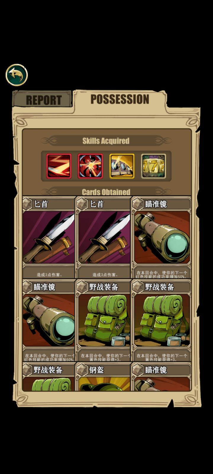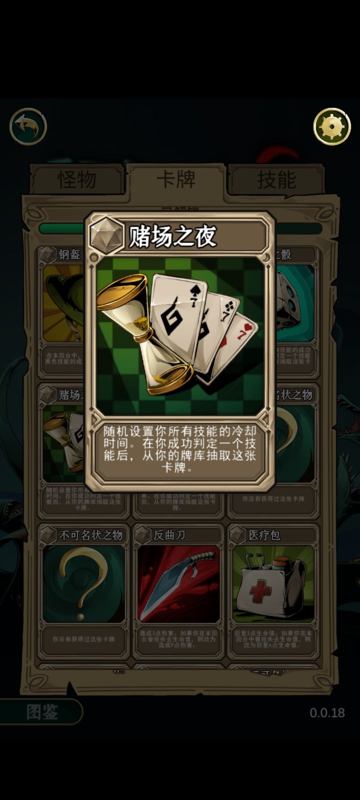 舍弃红色技能,本来要想来个白色技能没想到来2个黄色,顺便说地雷虽然爽,但第二个黄色技能最欧了,一半小怪都是抽出“非boss胜”的卡牌,还有各种加血加理智的药剂😁
