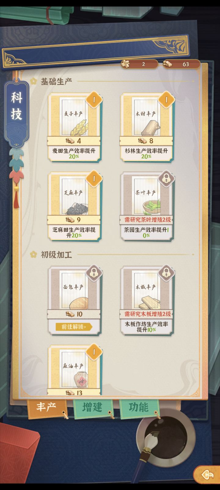 现在27级①这个蓝色号角现在可以升级么?还是等开出高级宝贝升级高级的?②科技这里,丰产,增建,功能这三个分类,优先点哪个分类?