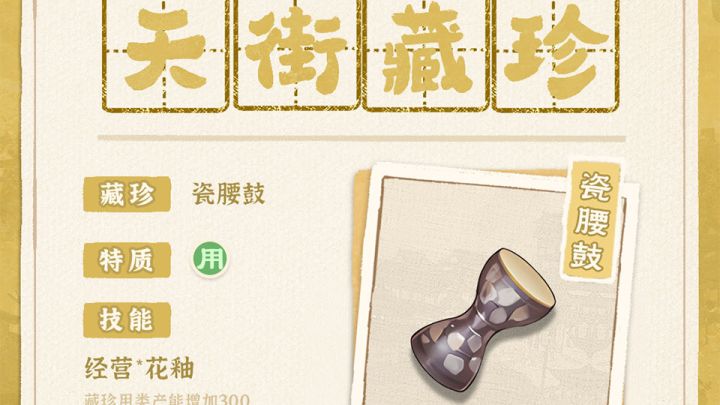 这次藏珍商人带来了不少的乐器来卖,说都是用上好的材料做的。 街主挑来挑去,最后买下了这纹饰十分奔放的瓷腰鼓,不知下次带上它与名士们合奏时,会带来什么样的惊喜呢?欢迎关注官方社区,了解更多游戏资讯和福利!游戏官网:官方微信:从前有条街/CQYTJGAME官方微博:官方小红书:官方B站账号:官方Q群:321290208