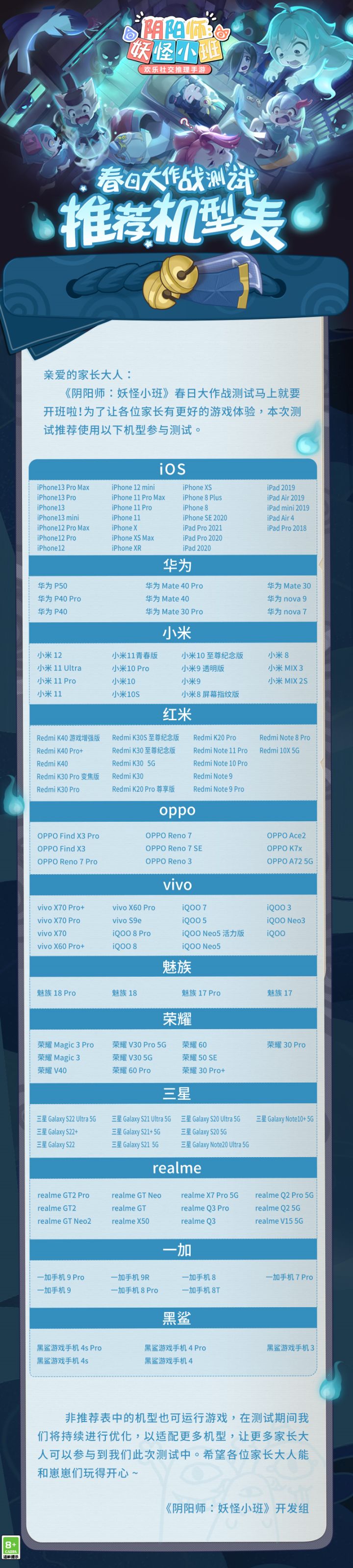 为了家长们有更好的游戏体验,小话痨还带来了本次测试的推荐机型表,看图查收哦!划重点:【非推荐表中的机型也可也以运行游戏】【非推荐表中的机型也可也以运行游戏】【非推荐表中的机型也可也以运行游戏】重要的事情要说三遍!