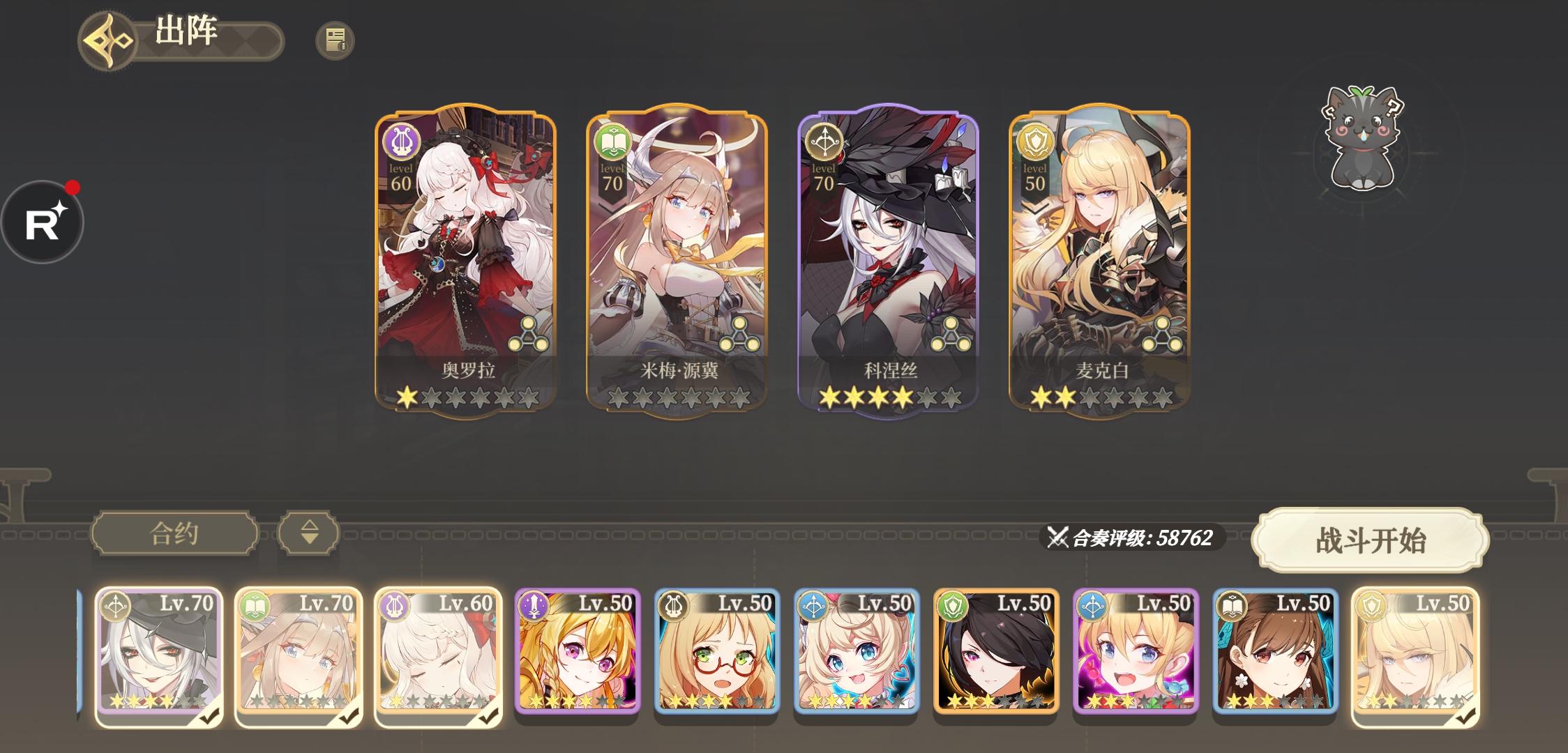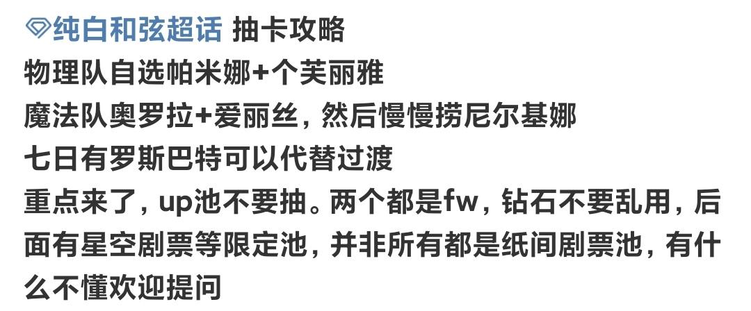 这游戏玩了8天开了好几个号发现自己是真的非酋!看论坛各个都是什么黑白龙几星,什么苏格兰几星的,作为一个穷比玩家真看到这些个SSR惆怅不已。。。别说满星,光升到3星都感觉要好久,练度低的话还不好打。。所以我就配了个凡骨队伍。。。。4张R组成的卡组,主C爱丽丝,辅助糖果兼副C,主奶老师,主T薇尔兼副奶。不得不说好几次打boss我的双C全被秒了,就靠薇儿和老师活活把boss磨过去。薇儿的成长攻击30秒后奶量还是可以的,老师我感觉应该是目前最硬的奶了吧。。。今天通过了探险第四章,有了个坦克爱丽丝就把薇儿给换下了。。。但是觉得有时候反而没有薇儿好用,可能星太低了。。不过如果有其他非酋像我一样没几个高星SSR的话可以试下我这阵容,用卡顺序也没有多大的讲究,反正就是法术机关枪。。。作为在SSR没有刷到高星前的过度真的棒棒的!