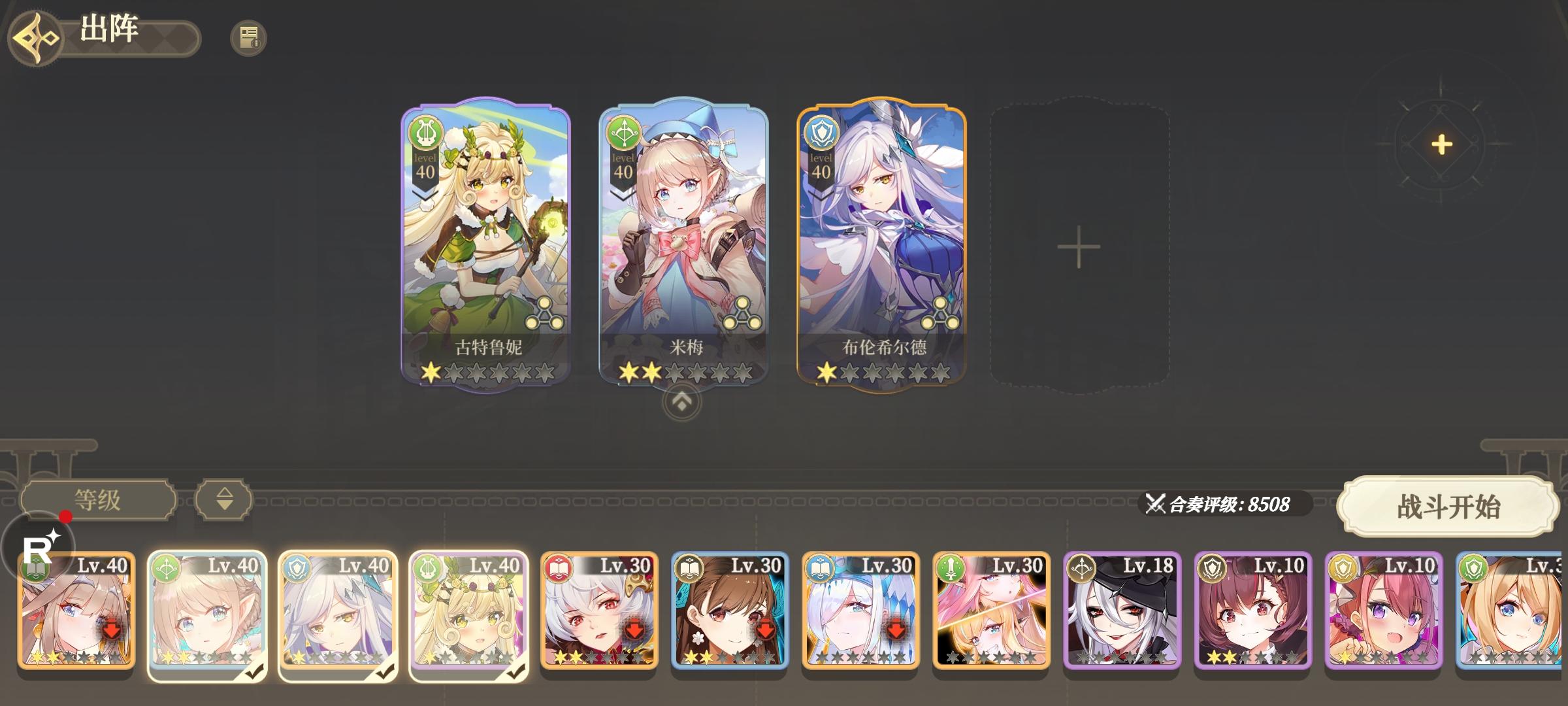 属于是2带一奶一输出了确定一个自己要养的输出,可以是送的,可以是任何一个高星C其实不太推荐用送的4星高费,太卡手。建议要带aoe的。就是带米梅和68的4星t,没钱那就白如果C选择米梅ssr,t可以选择黑龙