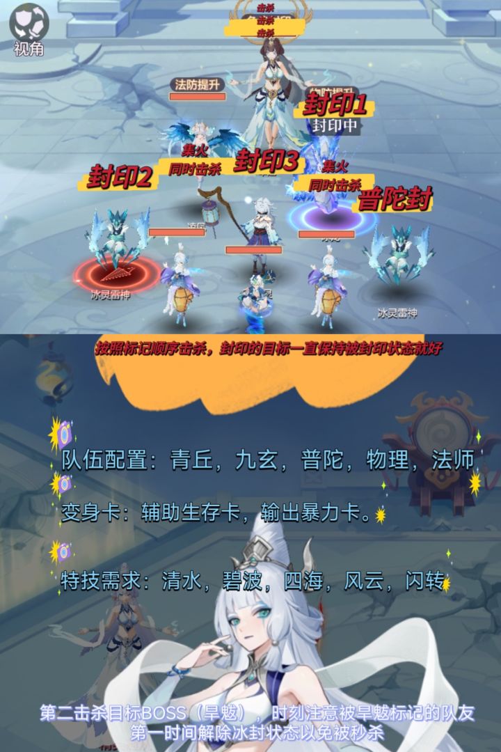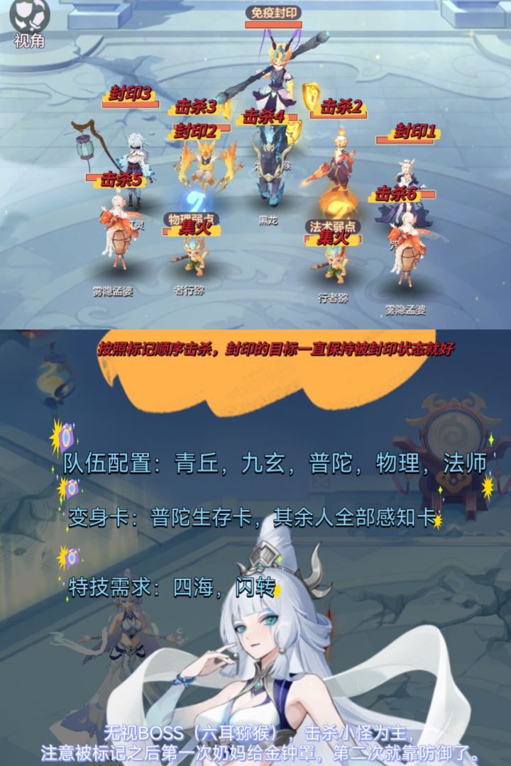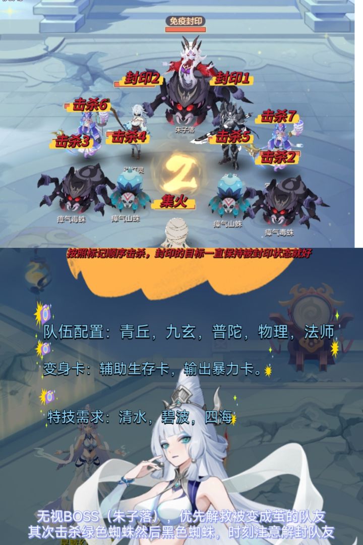 本攻略有一定程度卡游戏机制,希望大家不要反馈给策划,让更多平民玩家过九霄5。第一步,组一个青丘、三刀、普陀。这三人带两花一剑魂去打主战场。其他两个队友随意打得过生死就行,其中一个去打生,另外一个挂机。青丘幽花,奶强化三刀第一回合追星,加剑魂杀魔抗蛇,两朵花杀物抗蛇,第二回合青丘幽花三刀去三刀主,然后就是一直集火主,第六回合内把主打死就行,然后六回合开始后打生的队友返回。外面剩下一个挂机的队友开