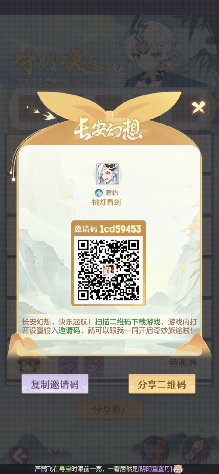 我在长安等你一起捉妖冒险!我是挑灯看剑区的君临,我的邀请码是1cd59453,快在游戏内打开设置输入邀请码,跟我一同开启奇妙旅途!