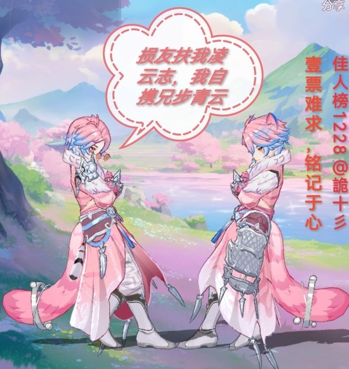 俺不帅,也不高。只要你需要,我会在下雨天,踮起脚为你撑上一把伞!来自长安幻想的我,需要你的一票,名次不重要,重要的是我们都经历过!詭十彡@谢谢你宝贵的一票,祝你新的一年里:一帆风顺,二龙腾飞,三阳开泰,四季平安,五福临门,六六大顺,七星高照,八方来财,九九同心,十全十美,百事亨通,万事如意!拜谢……佳人榜/编号:1228/詭十彡#长安幻想