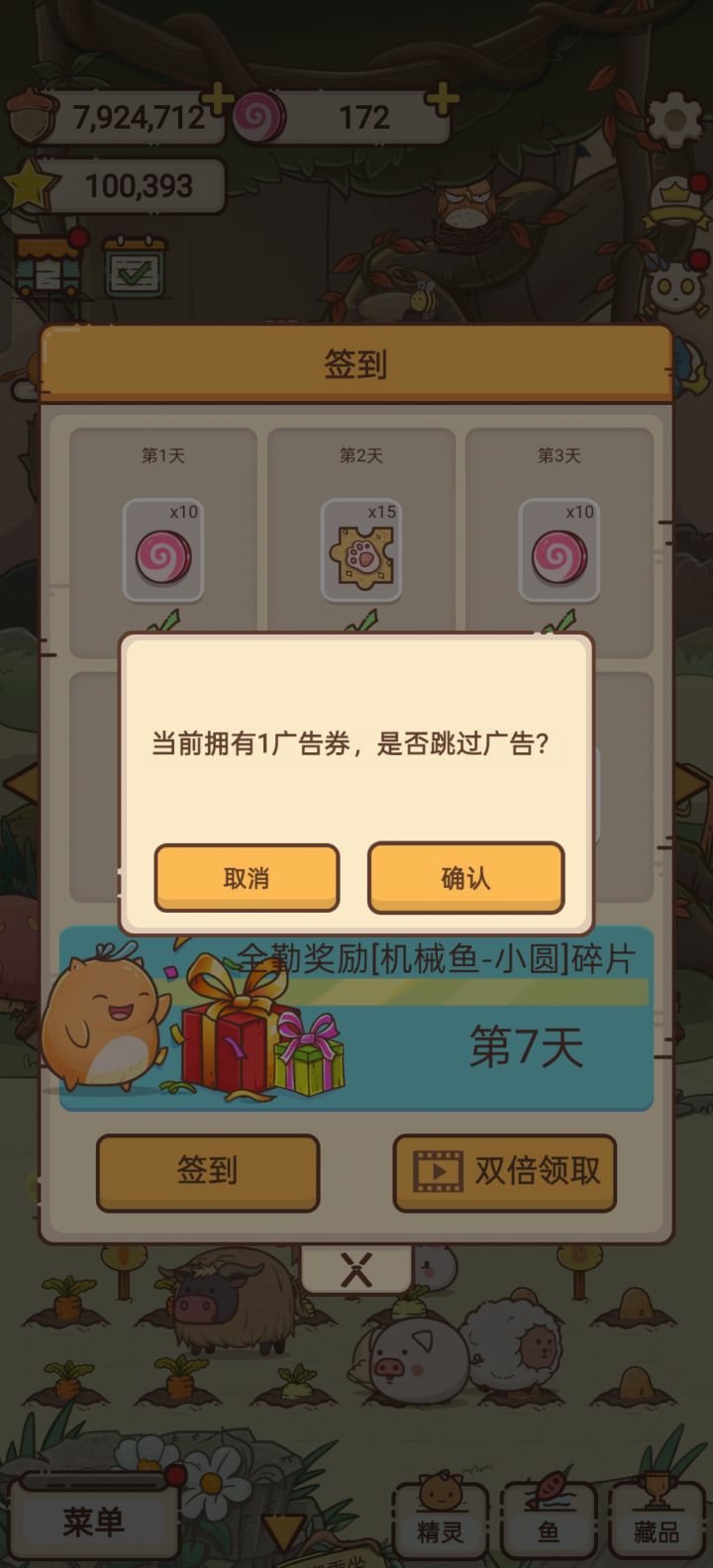 签到第7天的奖励,直接点领取也领不了,我兑换了3张广告券,用广告券点击双倍领取,点完就卡了,也点不了叉也做不了其他东西,只能关闭游戏重新打开签到,再次使用广告券,此时显示3张变2张,但第一次其实奖励没有领取到,然后这次又卡了,我又关闭重开,OK2张变1张了就是如今这个截图,。。。。?怎么破!!!我的广告券呀。签到奖励也没有!!