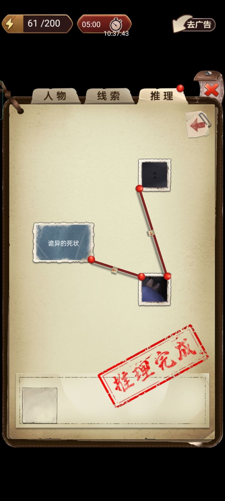 1、推理完成之后就会进入一个剧情当中,之后六叔也会死亡,接着来到六叔死亡房间。点击地上可以得到地面上的水渍,点击床上尸体。2、在床上尸体胸口上获得的怀中的玉,点击尸体旁边可以得到一叠黑纸,点击赵员外的脸可以获得赵员外的死因3、点击床下的箱子,点击紫色的包裹可以找到3个玉佩,还有小布包线索4、在皮箱衣服的角落还可以找到白玉蝉5、点击桌子,在桌子可以找到又一张请帖,一叠名片,荷叶包,地上呕吐物