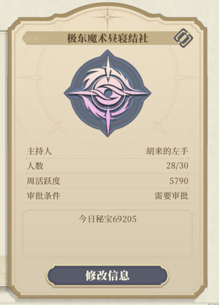 极东魔术昼寝结社招新,现有少量空位,欢迎各位新老玩家加入,争取一起做活动领奖励~另祝大家抽卡顺利,次次10连出货,卡池不歪~