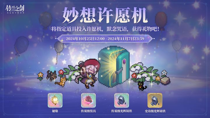 团长,许愿机好像聚宝盆!只要把光辉铸铁放进去,闭上眼睛默念咒语,就能获得更多更高阶的光辉铸铁!⭐活动时间:2024/10/25 12:00 - 2024/11/07 23:59⭐ 活动说明:活动期间每日解锁1次新的许愿,一共7次许愿机会。将指定道具放入许愿机即可获取各式光辉铸铁。累计许愿6次后还可获得许愿机的礼物秘缘*5、传说级装具等。⭐ 活动奖励:秘缘*5、随机传说级装具、传说级光