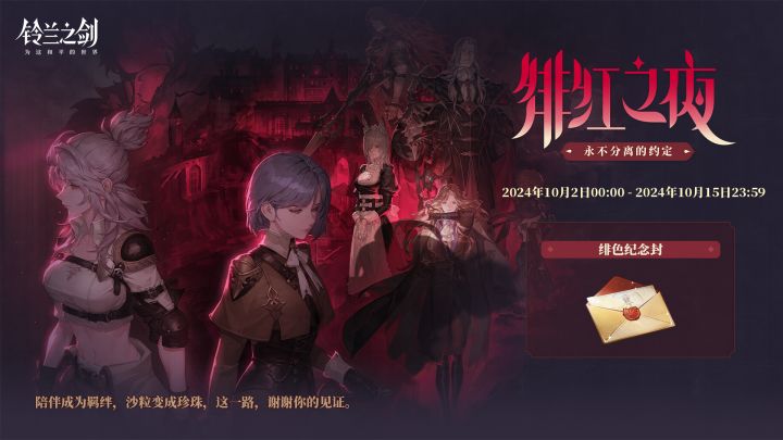 陪伴成为羁绊,沙粒变成珍珠,这一路,谢谢你的见证。团长,在新的故事开始之前,就请你帮忙珍藏这份记忆吧。💌 活动时间:2024/10/02 00:00 - 2024/10/15 23:59💌 活动说明:活动期间,在活动页面签收「绯色纪念封」后,即可前往「绯红之夜」版本活动领取秘缘*10!◆ 官方公众号:铃兰之剑◆ 官网游戏下载:↓↓↓