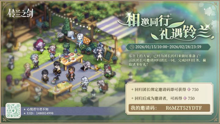欢迎各位老玩家回归,现在回归填写邀请码即可领取750钻石的奖励噢,而且即将下个版本,是回归的好时机,感谢!5GHQDWZCERL