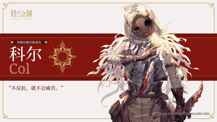 戴着面具的神秘刺客。寡言少语,但出手却疾如闪电,令对手胆寒。科尔时常跟随着米格尔佣兵团进行活动,相较于其他生性散漫的佣兵,科尔的作风异常地干净利落,让人难以捉摸其背后的动机。#铃兰之剑