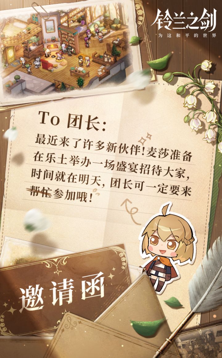 团长团长!麦莎送来了一封邀请函,快看看是什么?听说明天乐土会有丰富的盛宴招待新伙伴,小场记也好想去参加!「激斗!乐土的盛宴」即将于明天12:00开启!#铃兰之剑