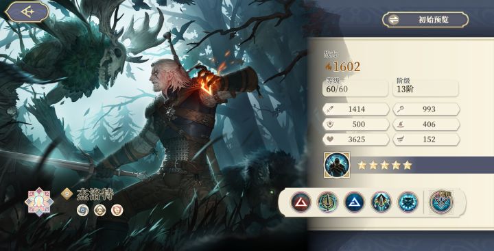 杰洛特是能力全面的猎魔大师,通过使用多种类型的魔药,能强化自身进攻或生存能力;同时根据战斗需要,灵活地切换成魔法或物理伤害的技能组。他具有独特而多样的法印技能,可以自行抉择是否需要瞬发释放;但在使用后,会使其他法印技能进入冷却。此外,他携带全新领袖光环,为<时空旅者>阵营的角色提供战力加成,且攻击定身敌人时伤害额外提高。一、面板解析阵营:时空旅者、漂泊者、不动如山基础物攻值:1414,全角