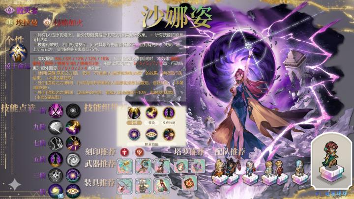 沙娜姿能对大范围敌人造成多段移位和碰撞伤害;同时对友方造成小额伤害,触发其受击效果而形成新配合。她能变身进入[原初之力],大幅提升魔攻、强化技能效果,消耗特殊的“烙痕”点数可维持状态。在星级提升后,她会获得[抹煞]敌人的能力,对生命值低于10%的敌人施加[禁不屈],并将其直接击败。角色一图流一、面板解析阵营:埃拉曼、侵略如火基础魔攻值:1718,全角色排名第1基础物防值:474,全角