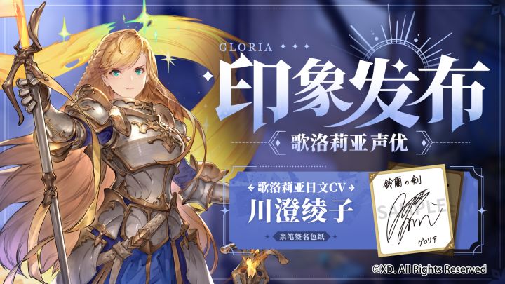 歌洛莉亚出身于骑士之家,一往无前的英姿和对正义的执着,使她成为骑士精神的楷模。以正义消灭一切不义,就是歌洛莉亚心中一直的追求。以自身的生命起誓,为了真正的正义!【中文CV:张安琪】【日文CV:川澄绫子】小场记特地为团长们准备了歌洛莉亚日文CV:川澄绫子的亲笔签名,在评论区回复参与活动,就有机会获得奖品哦~【活动时间】即日起-10月9日17:00【参与方式】在评论区写下对歌洛莉亚的