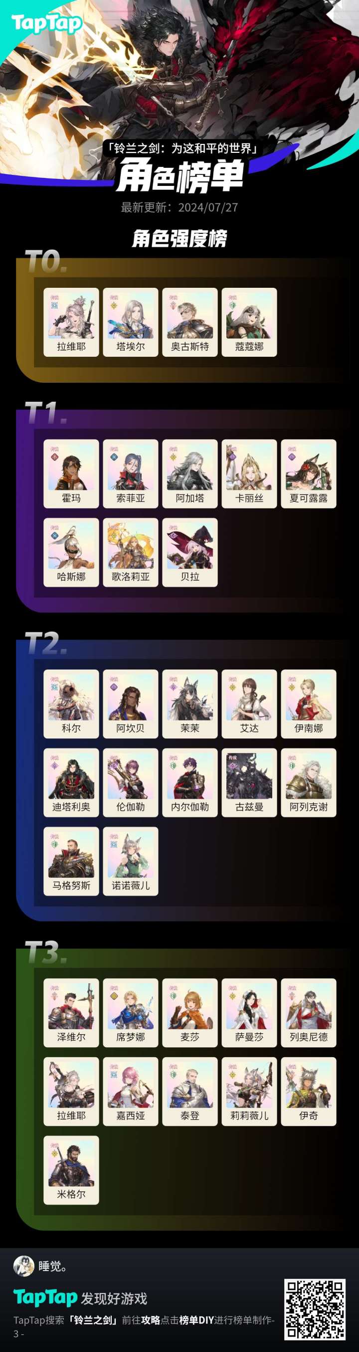 根据之前版本节奏榜的反馈。对整体角色性能和应对各个副本环境下的表现都做了分级。但由于细化内容过多,舍弃了图片形式,改用表格记录。后续节奏榜的更新,主贴会标红记录解释。表格内也会标红处理,每个角色的使用都尽可能思考到了各个场景的应用,尽可能的保持相对的客观。后续若有想法大家也可以在评论区讨论【腾讯文档】铃兰之剑角色节奏榜(V1.2)https://docs.qq.com/sheet/DVk9q