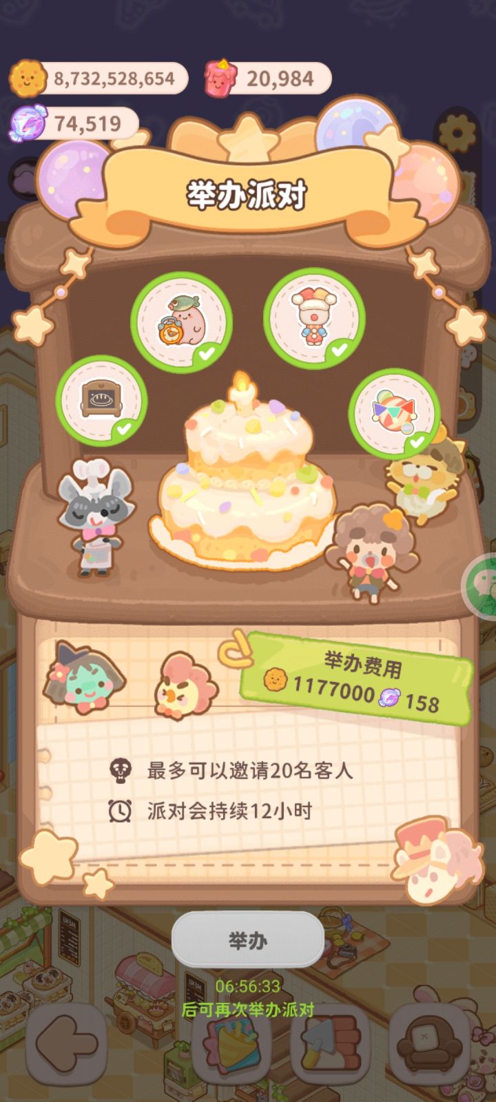 关于派对新玩法的攻略第一栏∶菜品(9选3)第二栏∶员工(6选3)第三栏∶服装(5选3)第四栏∶氛围装点(5选1)注意事项①菜品,员工,服装的准备位用糖果购买,初始服装2套(一套小饼干买,一套糖果买),初始氛围装点2套(一套小饼干买,一套糖果买)其余的服装和氛围装点通过派对获得②菜品选择∶根据菜谱位置和菜品等级,如果所有菜品都满级的话,菜谱位置越靠后的菜品花费越大,收益越大(指的是餐