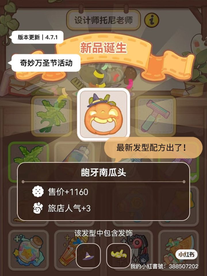 🌟版本更新丨4.7.11.奇妙万圣夜”限时活动开启在2022年10月30日至 2022年 11月8日每天登录,可领取超值福利(今天下午更新,30开启活动)在挑战中赢取小南瓜,可兑换饼干和糖果,还有万圣主题家具!2. “捣蛋鬼屋”系列家具上新6件家具3. 万圣限定纪念物和发型来袭1个发型、1个纪念物4. 大楼皮肤“田野牧歌”上架3499🍬、35人气[蜡烛]5.餐厅新增“狂野西部”主题1