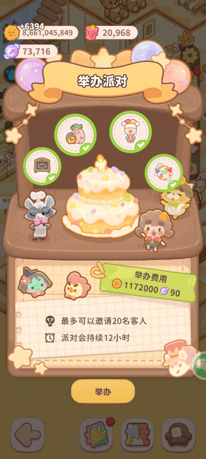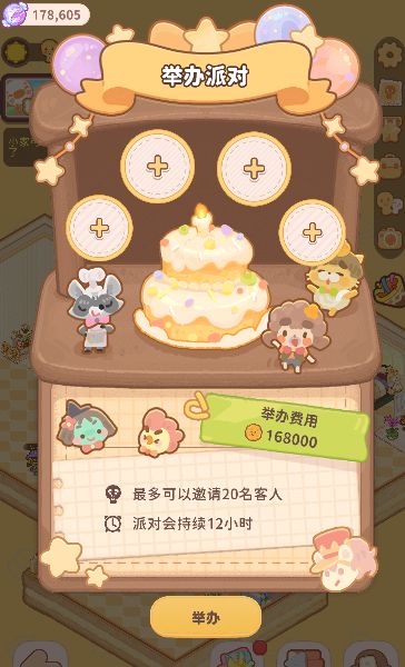 6.8.0更新的派对玩法,取消了派对等级可以自行选择菜品,员工,服装,氛围装点(派对时间为12个小时,结束后会获得小饼干+糖果+服装或者氛围装点)