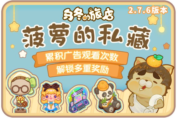 新的一周伊始!店长们期待已久的活动终于来啦(此处掌声雷动)!【菠萝的私藏】将在2.7.6版本更新登场!累积广告观看次数即可解锁对应奖励,除了有本冬的新套装文艺小狗勾,还有全新客人穿梭在梦境中的爱丽丝!超萌Q弹的童年玩偶“胖达伙伴”,当然少不了炫酷科技动效家具“虚拟体验VR眼镜”!还在犹豫什么赶紧打开游戏把他们全部收入囊中吧[坏笑]还有更多精彩内容就等店长们前往游戏发掘了!如果您对此次更新有任何的