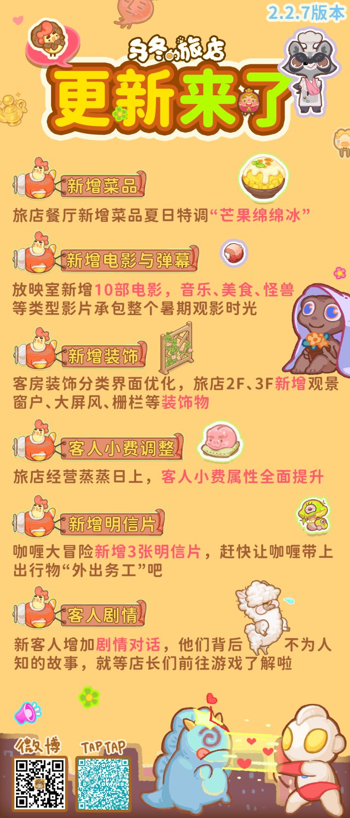 还有更多精彩内容就等店长们前往游戏发掘了!如果您对此次更新有任何的疑问或者更好的建议,欢迎店长们评论留言告诉我们,期待您的反馈!加入官方Q群参与玩法讨论,或者通过公众号、微博、TapTap、游戏圈即可获得游戏更新爆料以及第一手资讯,官方微博更有兑换码不定时发放,有任何问题想法都可以私聊乌冬。◆新浪微博:(@乌冬的旅店)◆官方Q群:1051304483(官方2群) 821437945(官方3群)