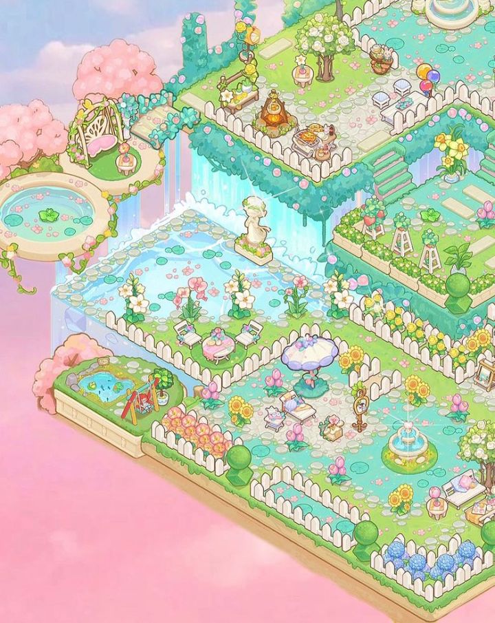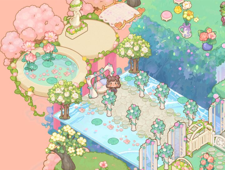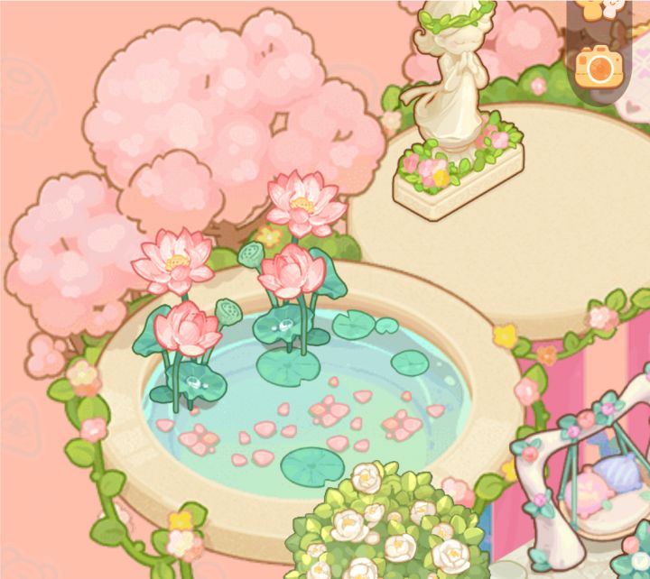 小花园p1最爱的荷花池!粉色的樱花被风吹到了荷花池里洋洋洒洒落了一片~p2类似于水中秋千(是借鉴一位po主的!对她的灵感改了一下下!两边的花柱 加上旁边的荷叶和花瓣~浪漫的打卡圣地p3下午茶花园 躺在长椅看花 品花 新鲜播种的大草莓🍓来上一个 酸甜可口精美诱人。旁边花圃里的花可闻 可拍 就是不能采~##小蓝盒开箱##攻略#单机游戏#游戏讨论#乌冬的旅店