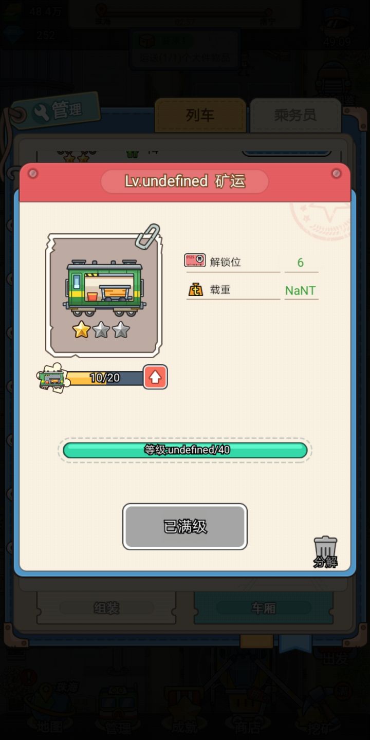 把矿车分解后才行,还有切换功能用不了,导致强制下载的安装包把内存变大了,之前测试看了500个广告,内存多了卡,可以删除数据,用切换把内存恢复以前的大小