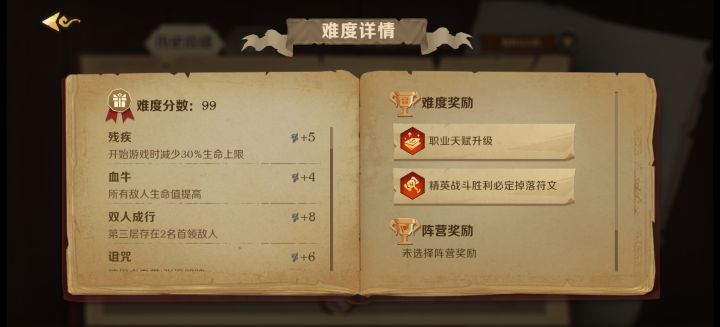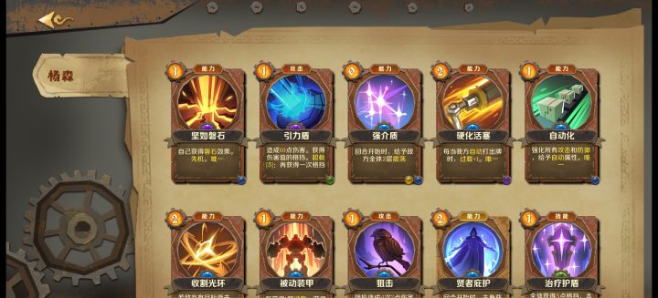 看大家说杨森过难度99比较困难,但打下来几把感觉其实还可以。未进行购买,所以天赋就是初始的。职业天赋选择辉煌印记(升级),前期每回合多一层过载非常关键。初始天赋独当一面(其实也没得选)方便多次获得格挡的同时对敌人造成损伤。难度奖励选择职业天赋升级和精英战斗必定掉落符文。整体思路就是叠甲苟活,然后小怪通过大量叠甲造成的AOE伤害清理,而大怪则需要一张卡,震裂一般几个回合叠二三十层震荡然后通过这
