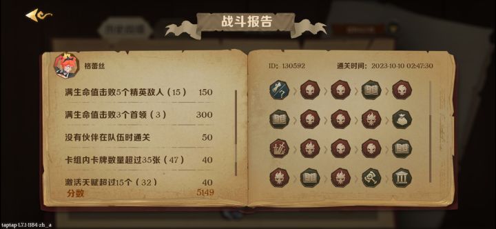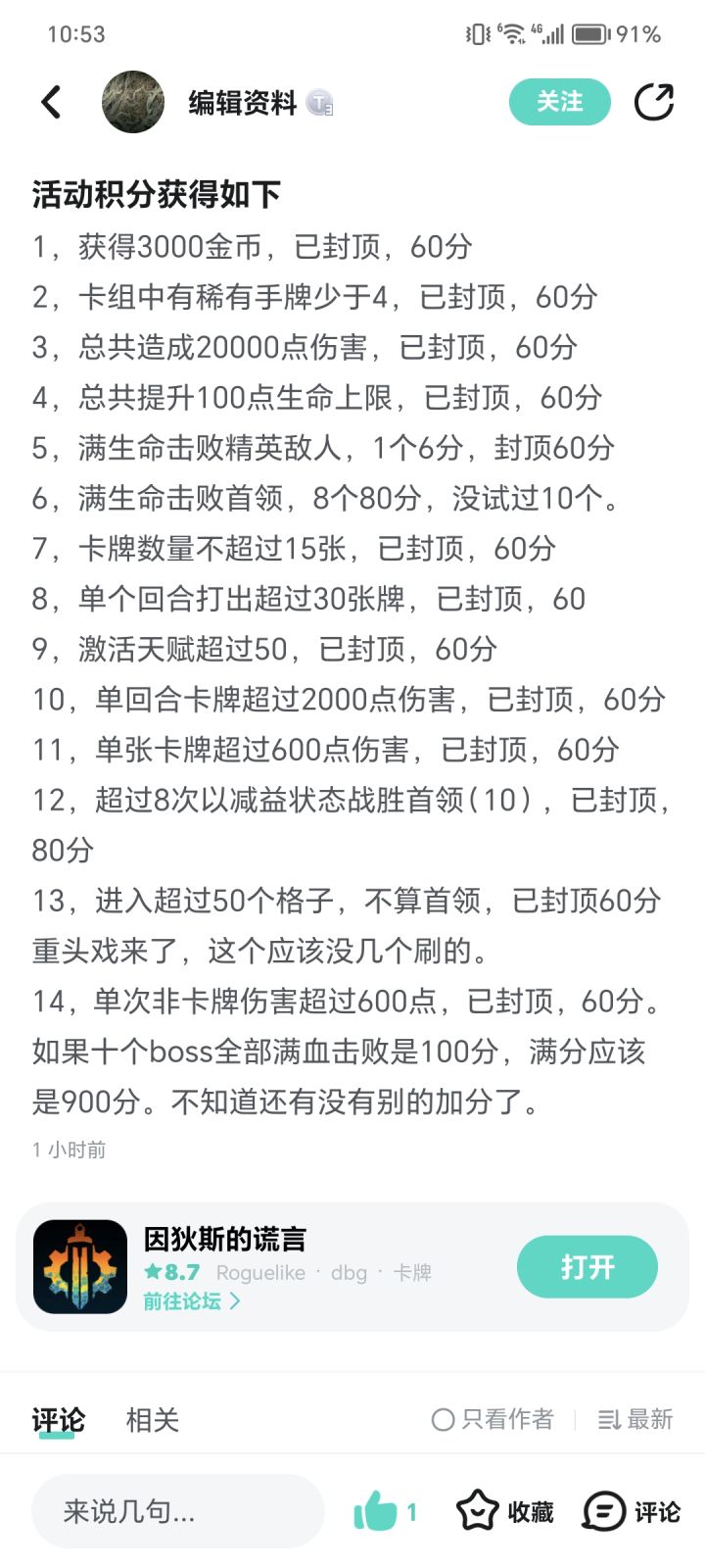 三天19局(一局被反伤创碎)肝满13500,模式是常驻非限时,本人白白夜夜休休倒班人,只能趁放假肝完,各位玩家请量力而行。为需要攻略的玩家们简述一下本人的思路,如有异议或者补充欢迎留言。据个人攻略习惯,以免费角色巫医阿尔贝进行讲解,其具体抓牌思路,请去b站搜索本人视频BV11N4y1a7Tn观看即可。至此,首先感谢论坛“编辑资料”大佬的积分总结。初