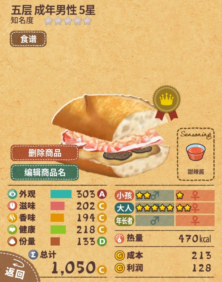 加甜辣酱5星!!!不加4星,比赛过关也够用了甜辣酱食谱=醋+蒜泥+辣椒粉+砂糖你们做出来星星不够的话,也可以试试加调料