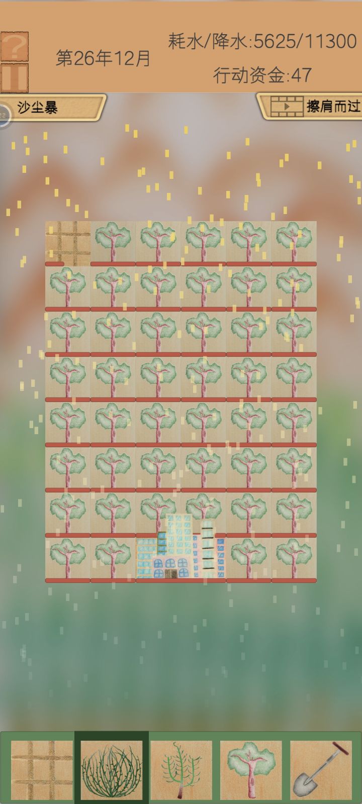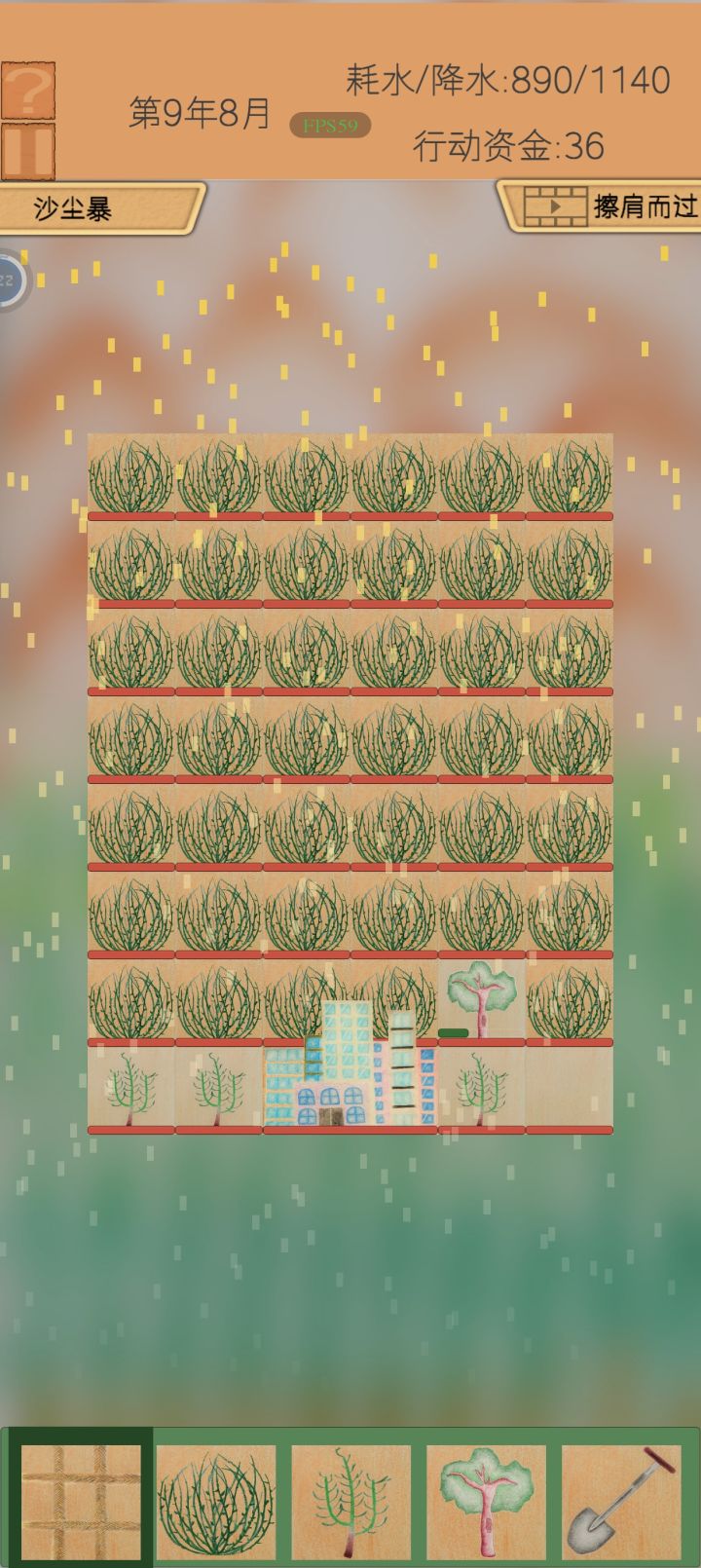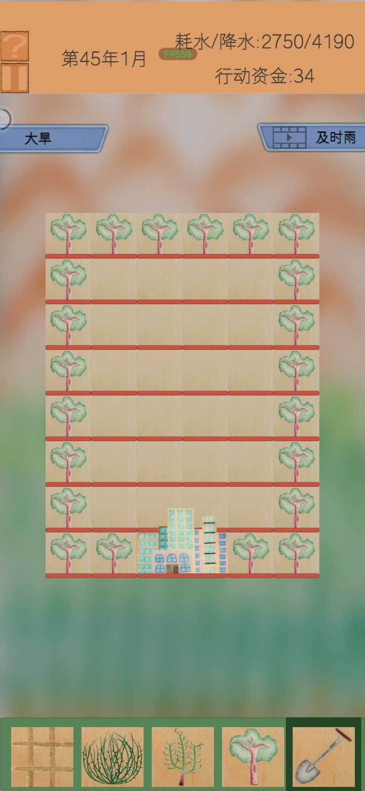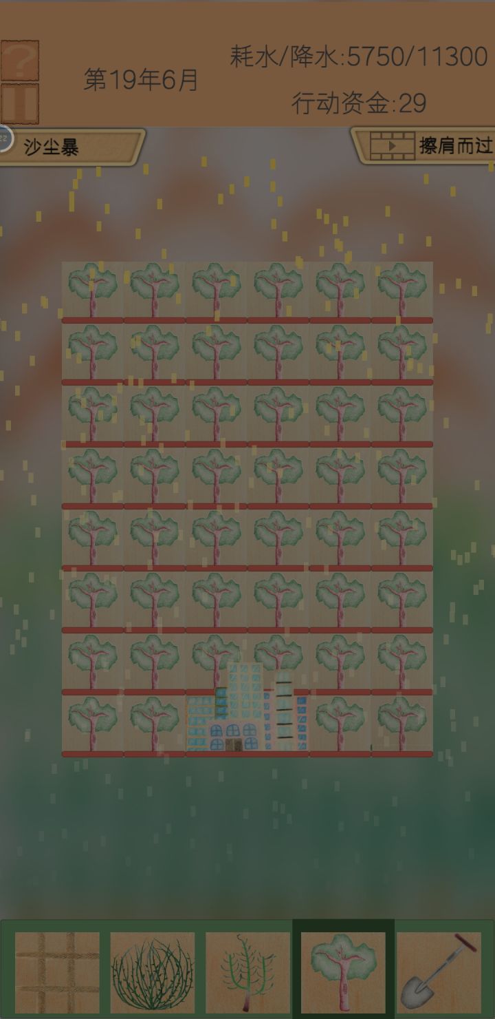 开局用草地把城市围个圈,先向左右种骆驼刺,再补齐两角,开始不要种超过三棵,遇到干旱不用怕,沙尘暴就停止种骆驼刺,把被破坏的草地补上等沙尘暴过了再慢慢种骆驼刺,在种完三排骆驼刺后,种的棵数可以慢慢增加,最后一排可以像我这样等一波一起种,也可以按刚刚的套路来。: )