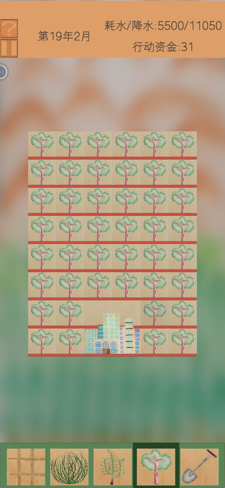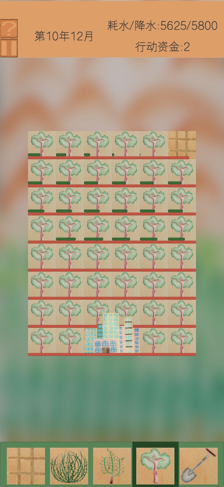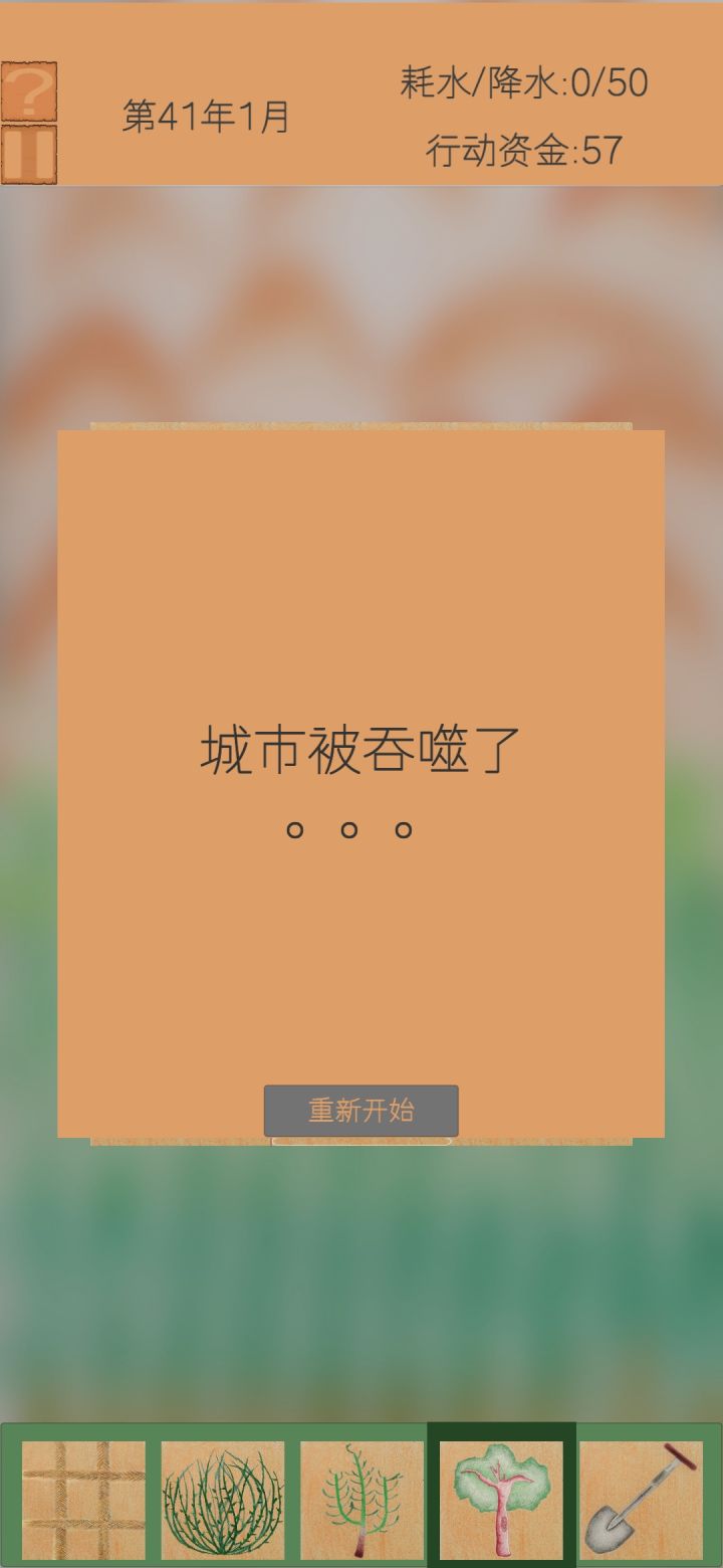 关于攻略方面我说一下 1,靠近沙漠的地方会很快被侵蚀,红色是血条可以参考一下,血条消耗完就是这块地死了 2,绿色条代表生长程度,绿条满了就是长好了,但是注意生长会占一部分耗水量 3,风暴会侵蚀,你就用草方格挡住就行 4,干旱会使降水量降低20%,当降水量降低大面积植物都会干死,要根据既有降水量来种植植物,如果干旱来临,耗水量大于降水量,紧急措施就是快速产出正在生长的植物,因为他们在没有长好之前会增加耗水量而不会增加降水量。 希望大家能看懂,这个小游戏挺不错的,有问题评论区告诉我