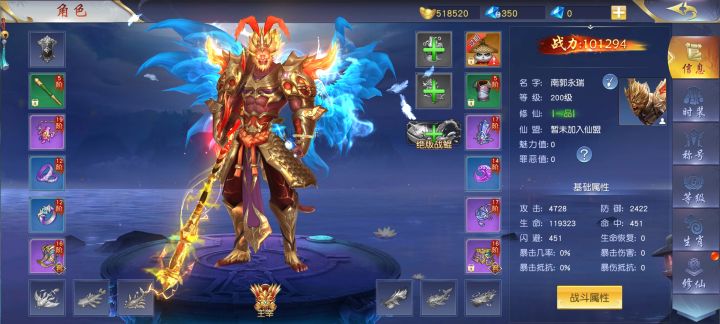 1. 角色-信息玩家可以在角色-信息界面查看到自己的基础属性以及详细属性,以及自身穿戴的普通装备、转职装备、灵鲲装备、小鬼守护、主宰装备、渡劫装备、特戒等。2. 角色-时装玩家可以在这个界面查看自己已经激活的时装、武器、气泡框、头像框以及属性,还可以选择自己想要佩戴的时装、武器、气泡框、头像框,更可以在界面中升级自己多余的时装、武器、气泡框、头像框获得属性加成3. 角色-称号玩家可以在这