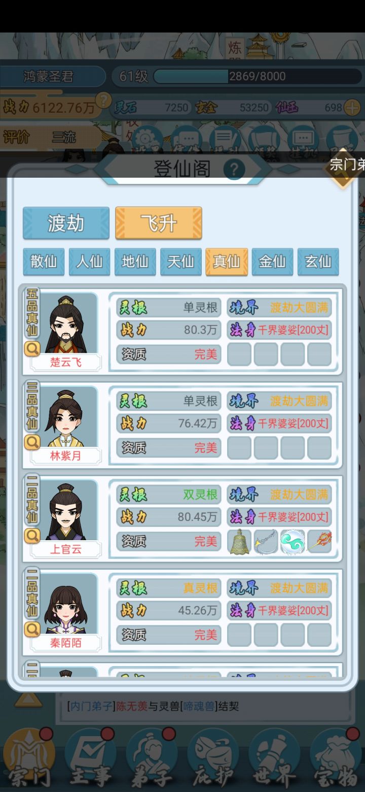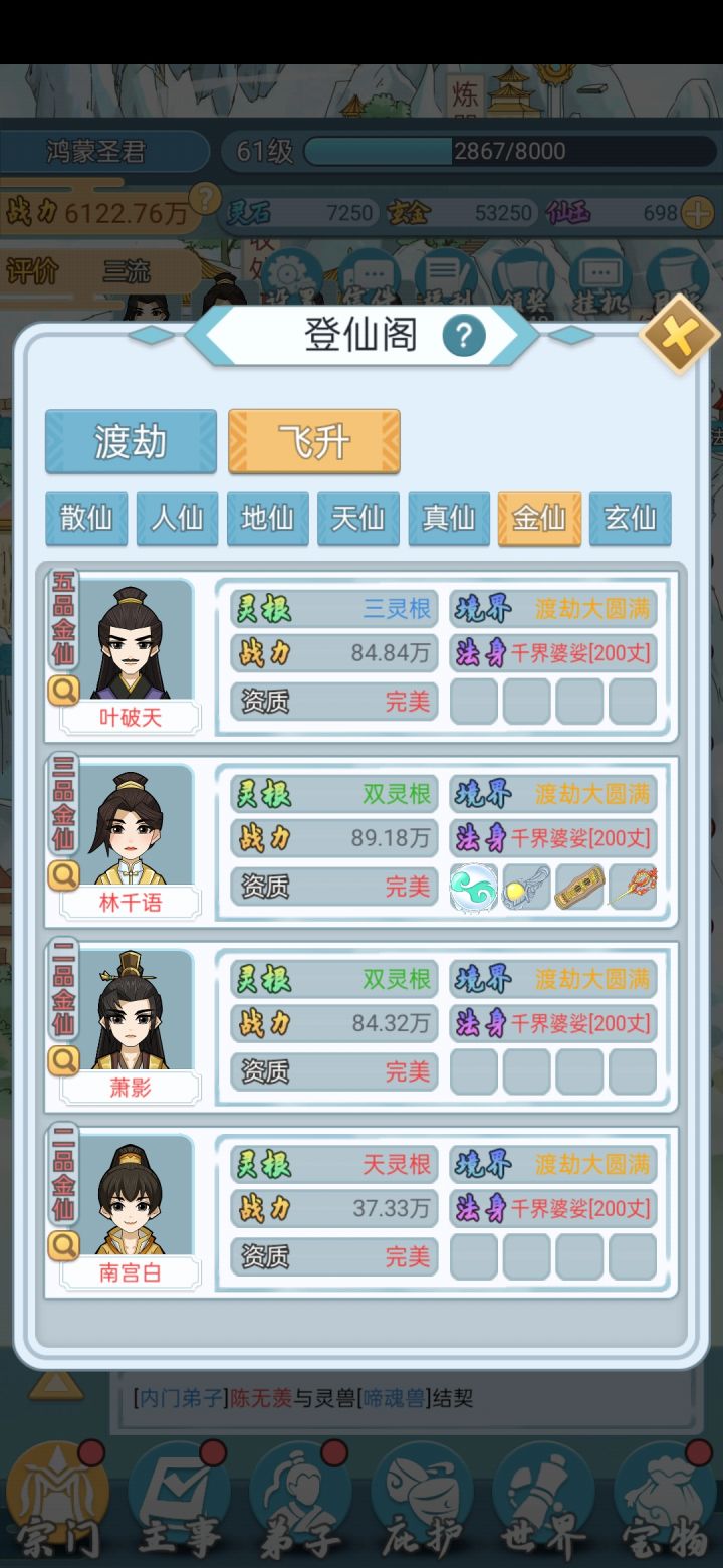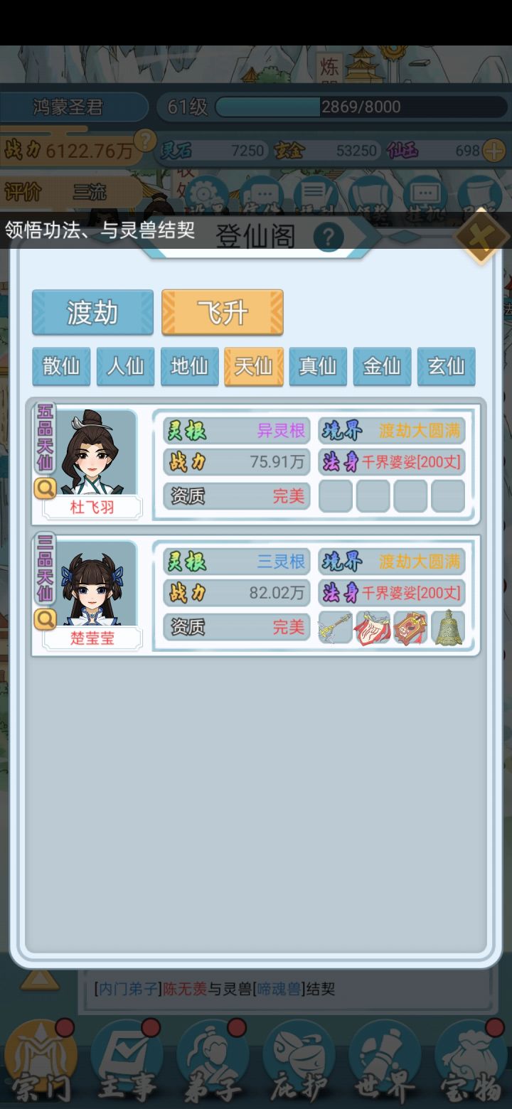 这个游戏广告有些多,能忍耐下去的请往下看吧。1.召弟子:弟子灵根优劣和门派的级别有关,刚一开始只能招单灵根双灵根的,级别上去了才能招到好的, 天赋红色的就行,天纵天选完美感觉没什么不同。弟子天赋其实没那么重要,+12的和+30的差不多少到最后都能升满,甚至升满了却由于技能/炼丹没学完最后还得等她们学完。可以看到混沌还不如双灵根战力高,因为前者熬的时间太短,技能都没学全2.仙玉有限用在哪里?